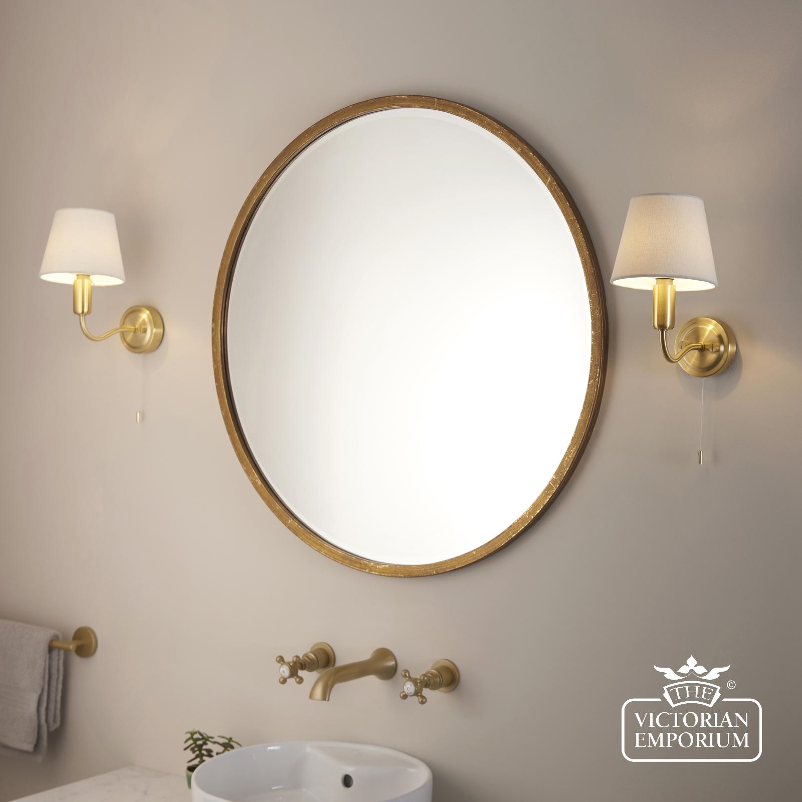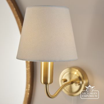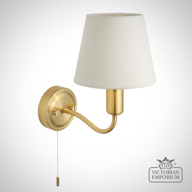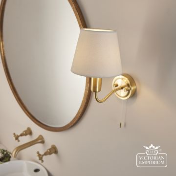 Timeless modern wall light with delicately curved arm. Brass plated metal work with Ivory fabric shade. IP44 rated and suitable for use in bathrooms.