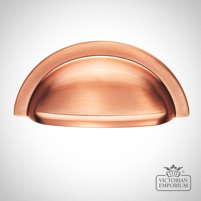 Product description: This is a satin copper pull handle in a traditional style with the stepped border accentuating the outline of the cup