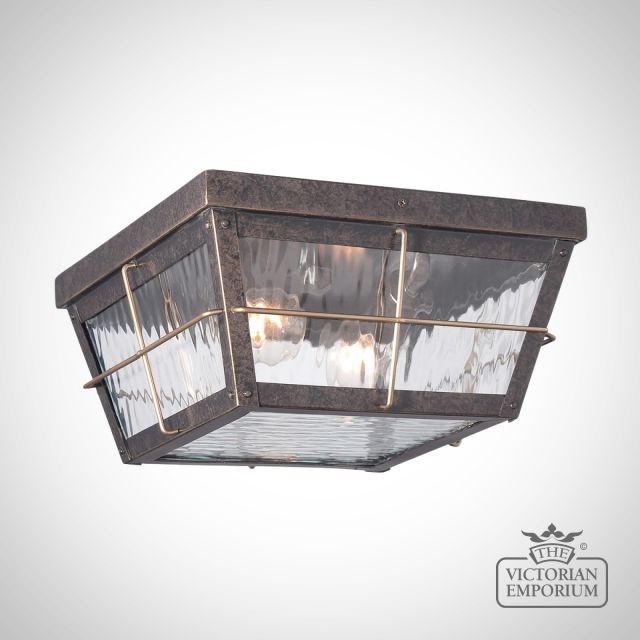 This flush mount outdoor light has a bronze finish and features clear water glass with brass accents for an authentic vintage look