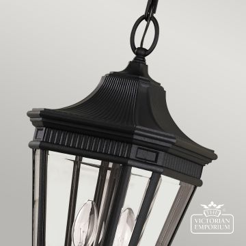 Black medium chain lantern with classic styling and panes in clear bevelled glass. Antique gas lantern-inspired, these die cast aluminium lanterns are available in Bronze or Black