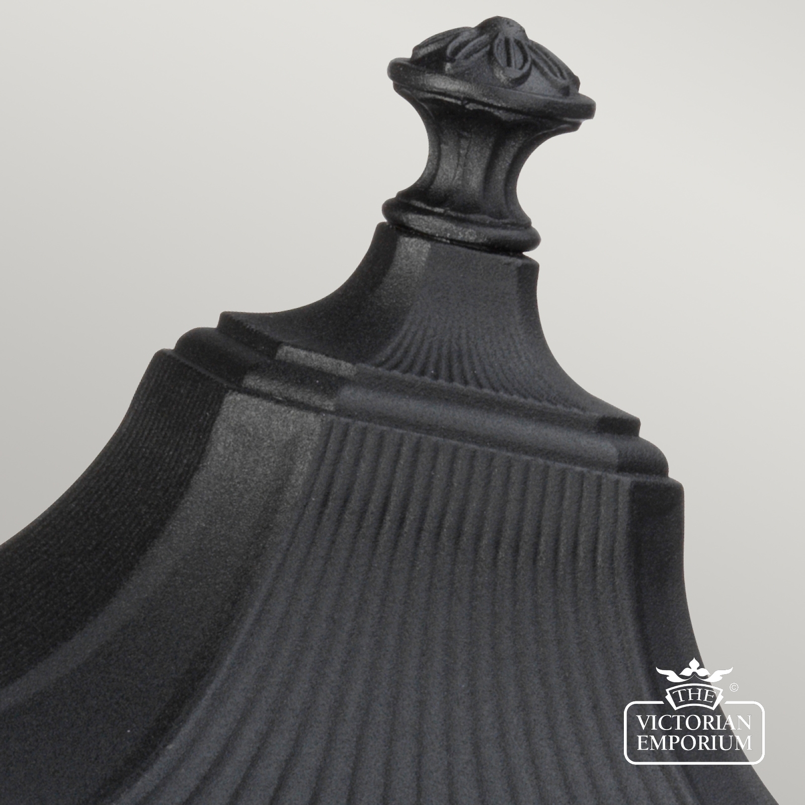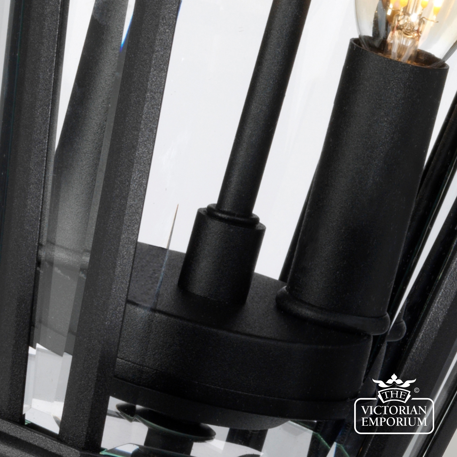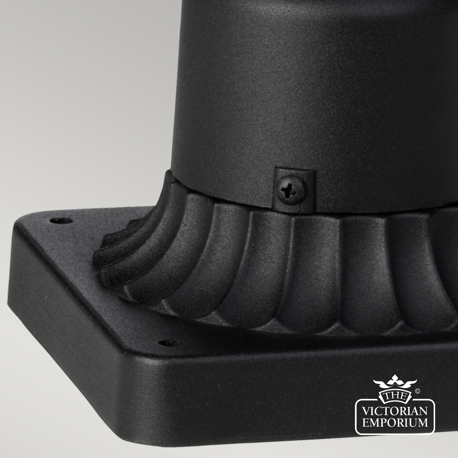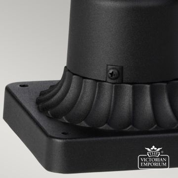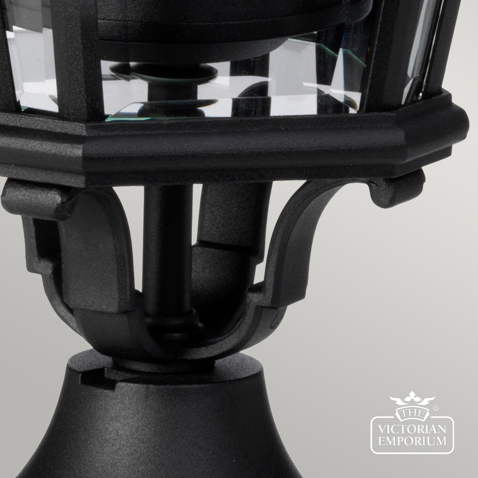 The classic styling of this pedestal lantern has the look of architectural moulding at the top of each pane of clear bevelled glass. This adds to the formal aesthetic of this antique gas lantern-inspired collection. Made of die cast aluminium and available in Bronze or Black