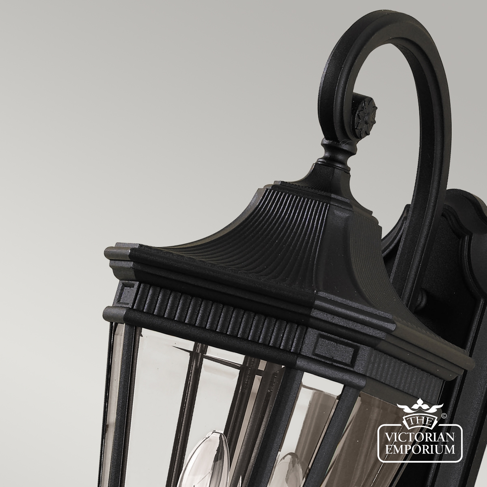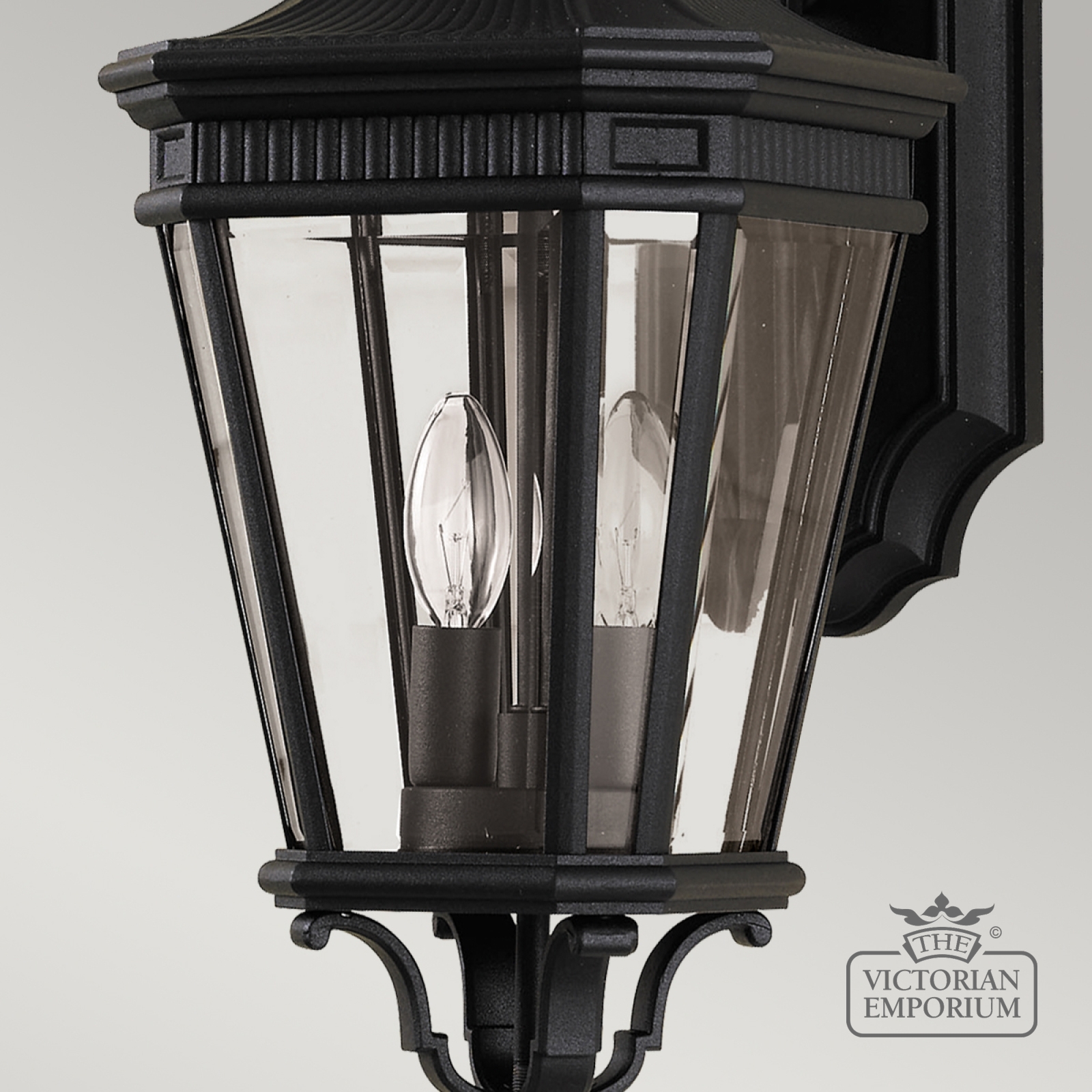 The classic styling of the Cotswold wall lantern features the look of architectural moulding at the top of each pane of clear bevelled glass. These die cast aluminium lanterns are available in Bronze or Black