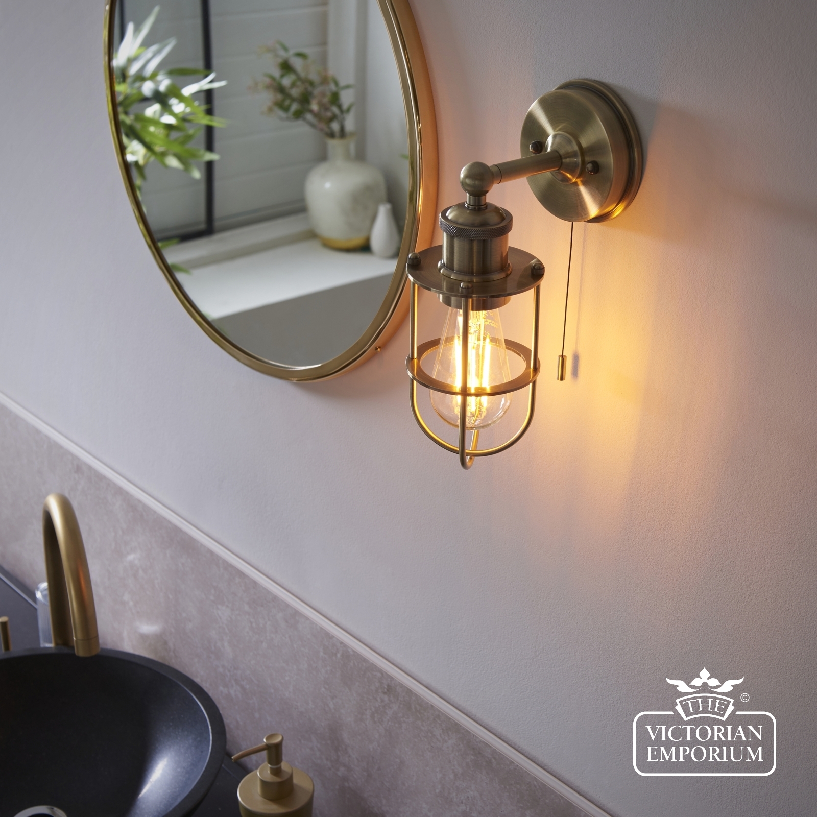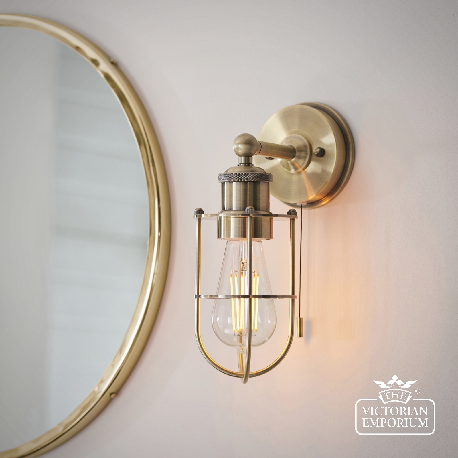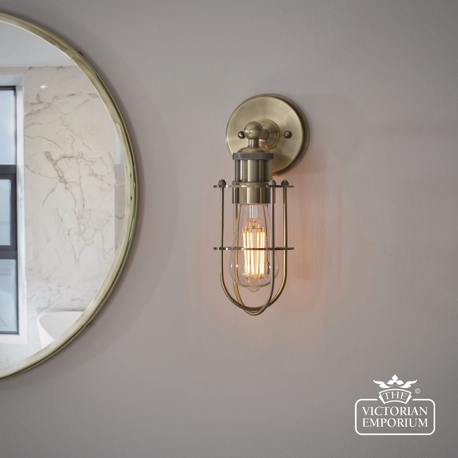Add industrial styling with this timeless IP44 rated wall light. Machine knurled detailing and antique brass bold cage design contrast with LED filament lamps.