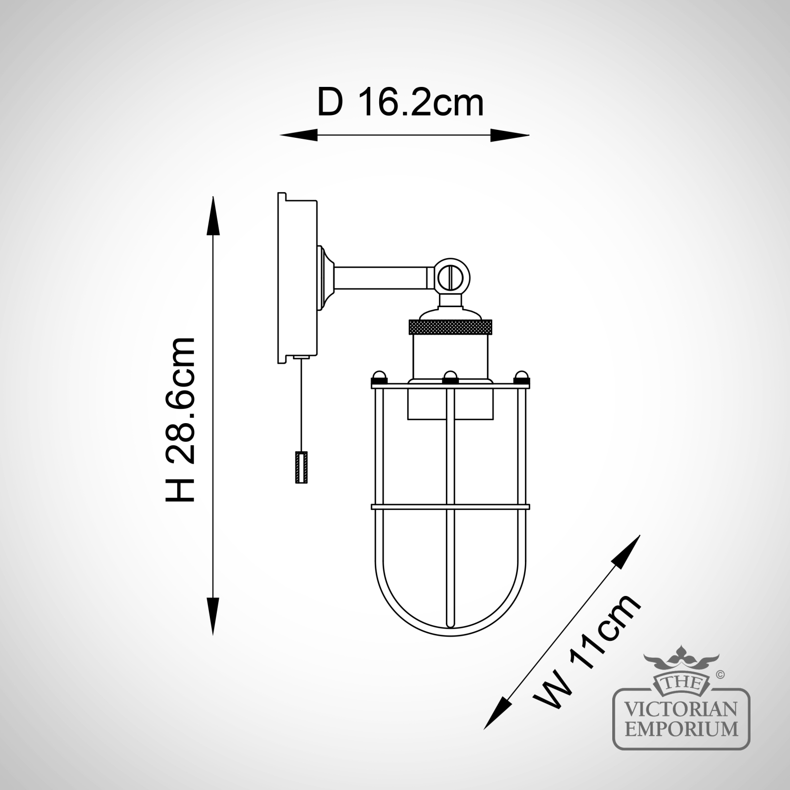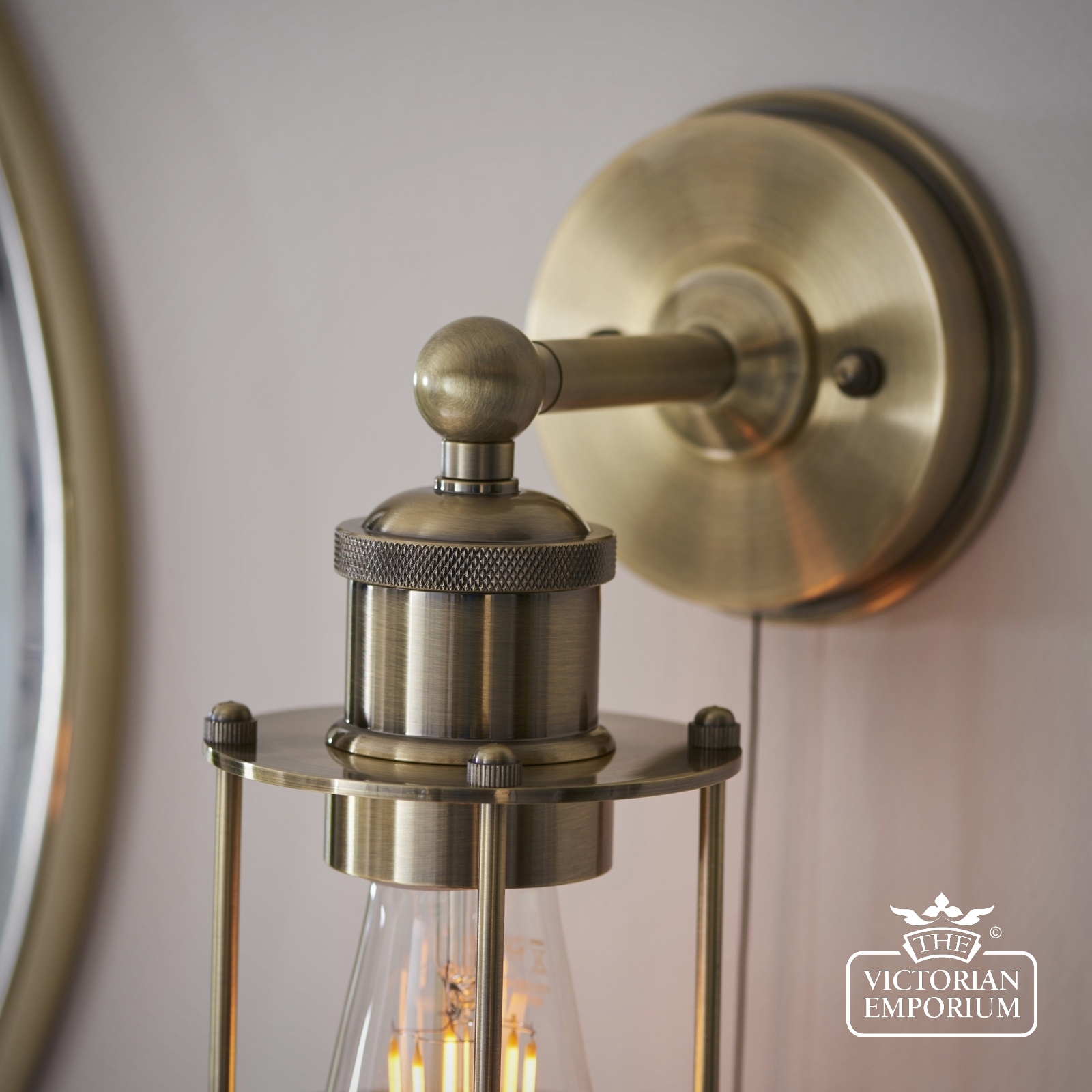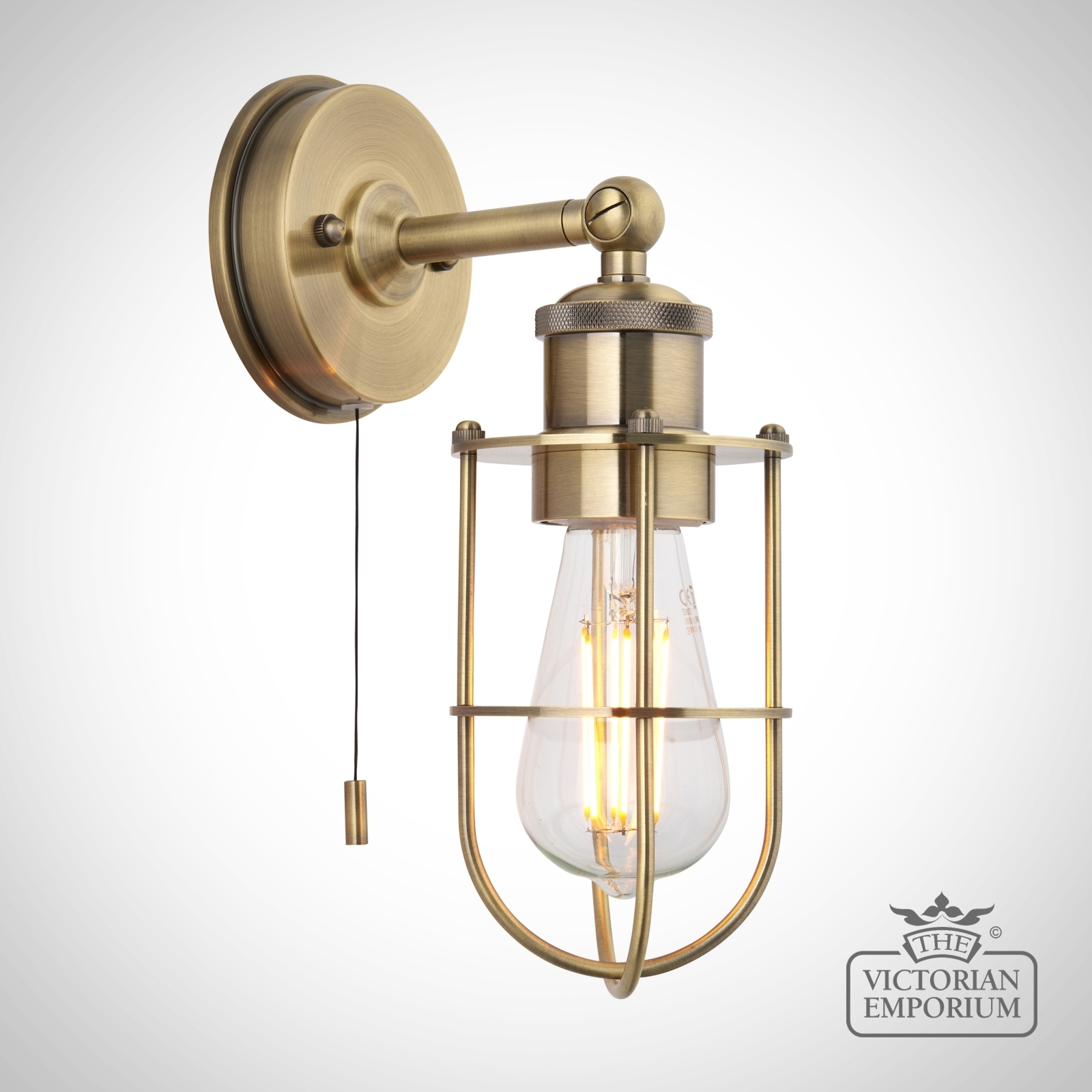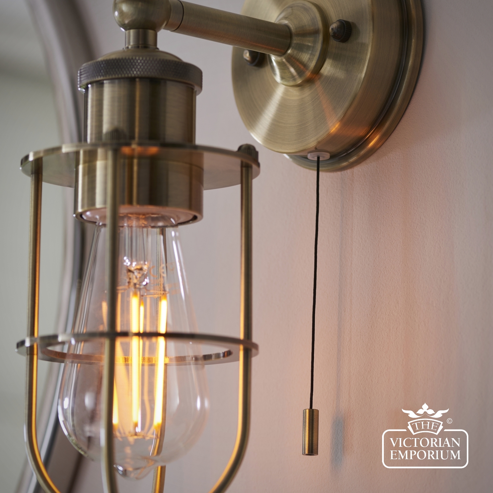 Add industrial styling with this timeless IP44 rated wall light. Machine knurled detailing and antique brass bold cage design contrast with LED filament lamps.