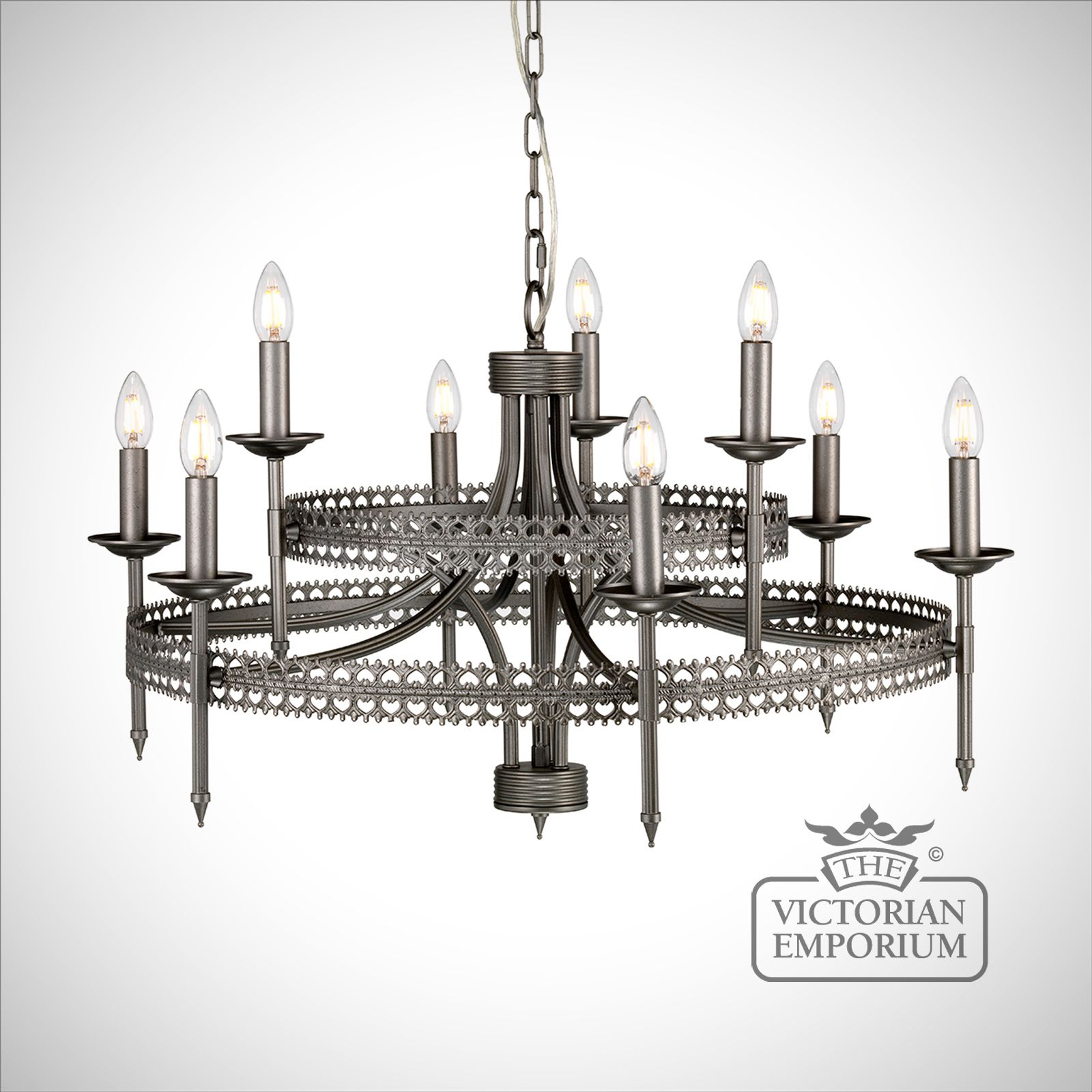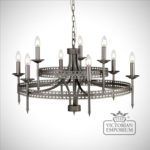 This light design is inspired by royal regalia and features hexagonal tubing and detailed fretwork bands with a grey hand painted finish