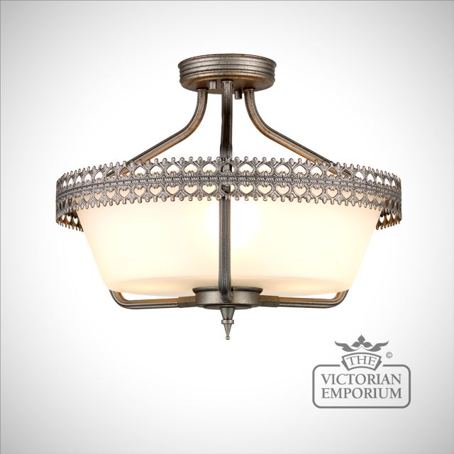 This light design is inspired by royal regalia and features hexagonal tubing and detailed fretwork bands with a grey hand painted finish