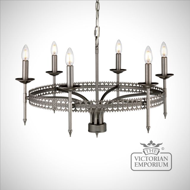 This light design is inspired by royal regalia and features hexagonal tubing and detailed fretwork bands with a grey hand painted finish