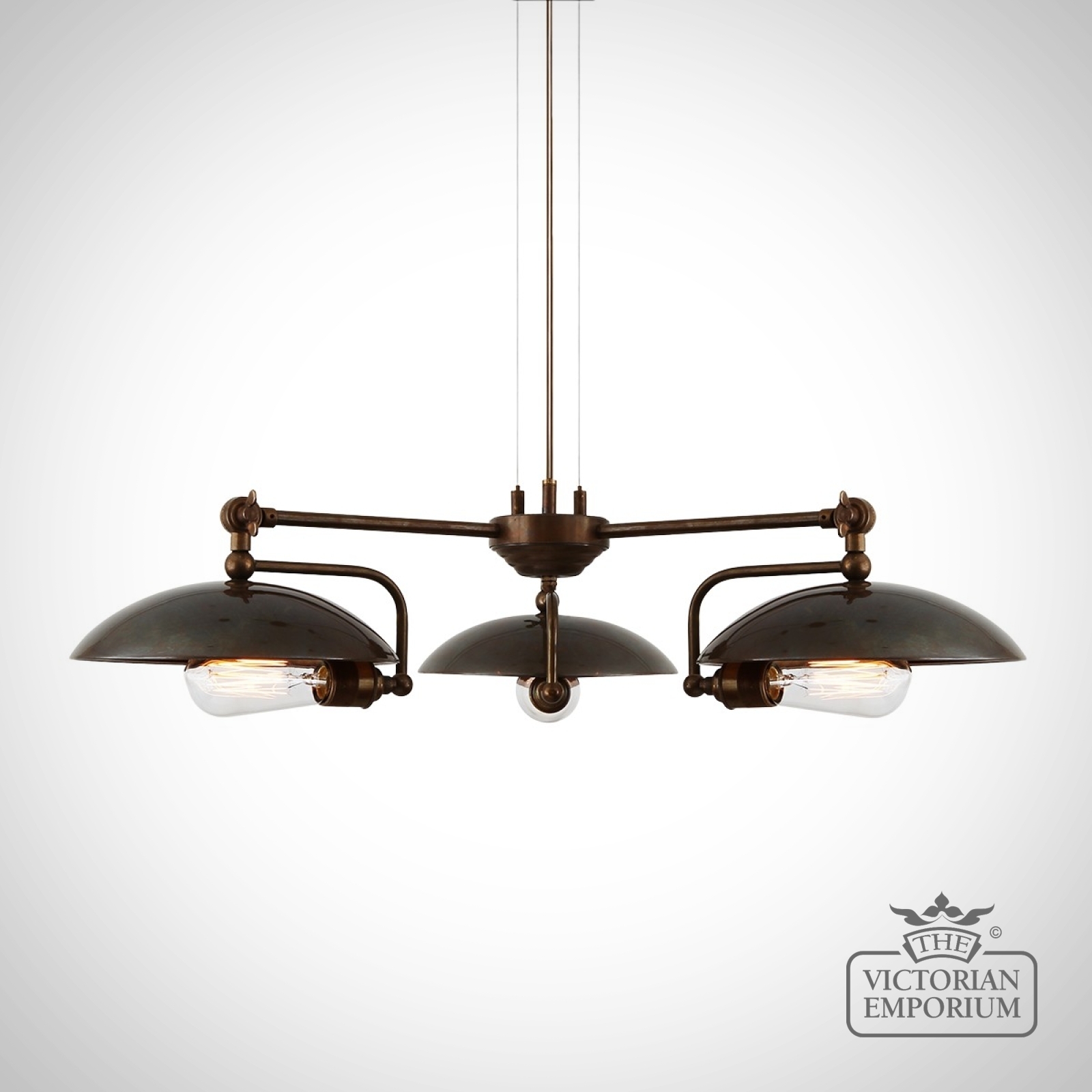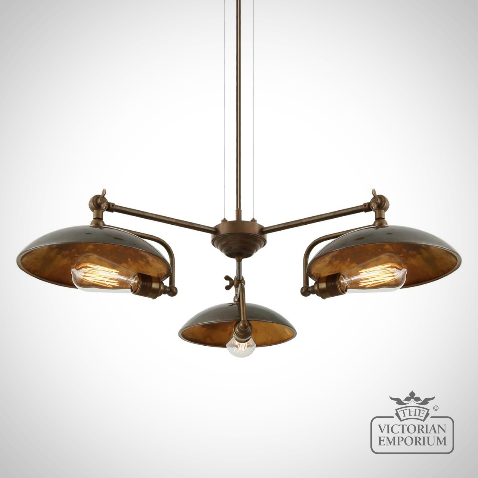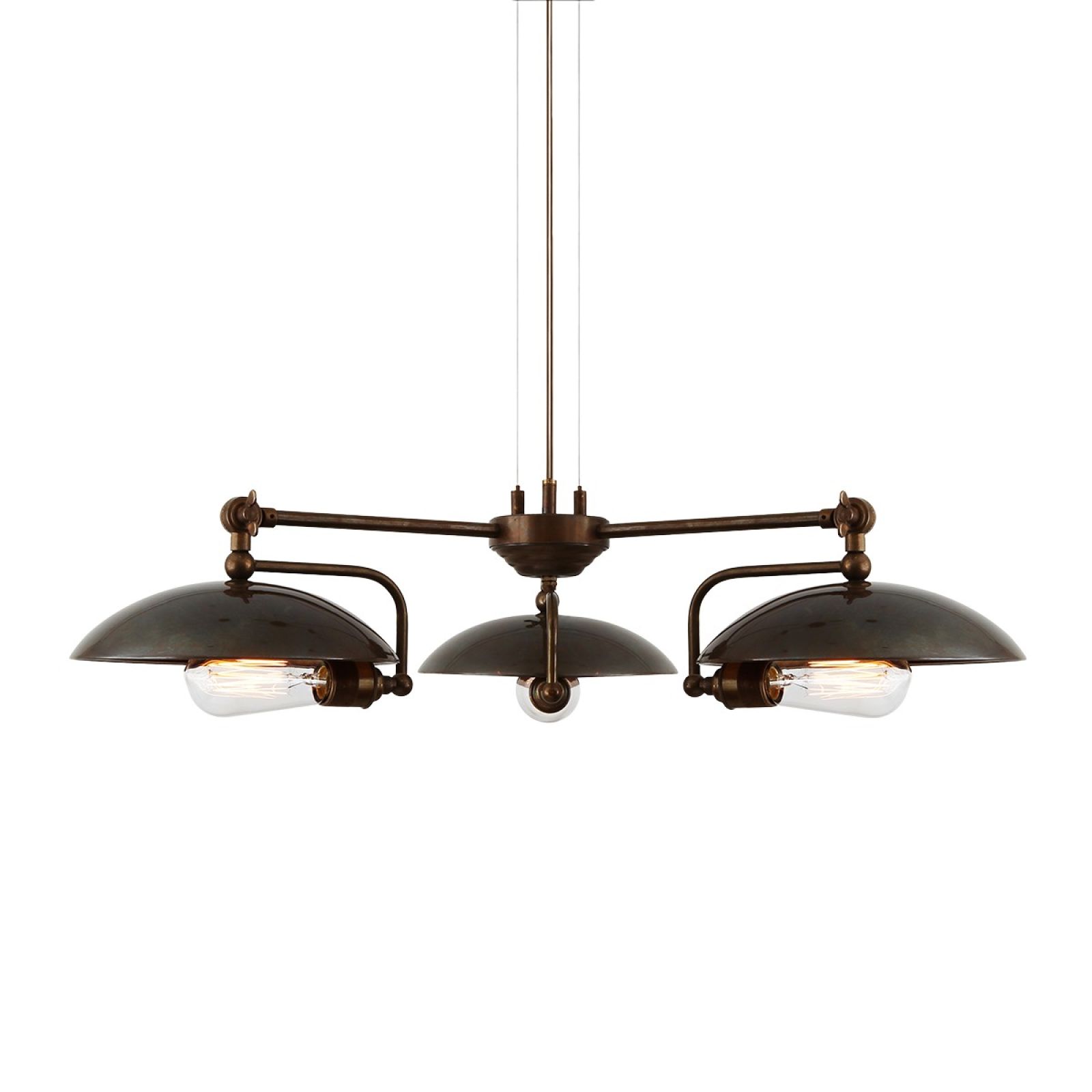 This industrial chandelier embodies the richness of the brass work. Looks fantastic when lit with Edison bulbs to create a dramatic warm reflection which changes depending on the position viewed. Bulbs are sold separately.