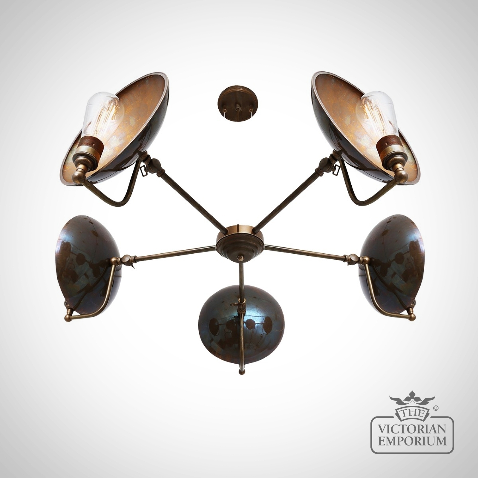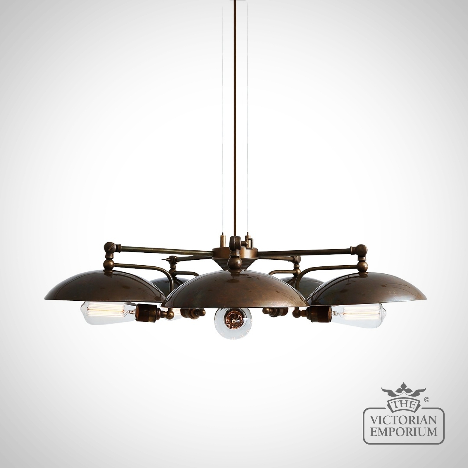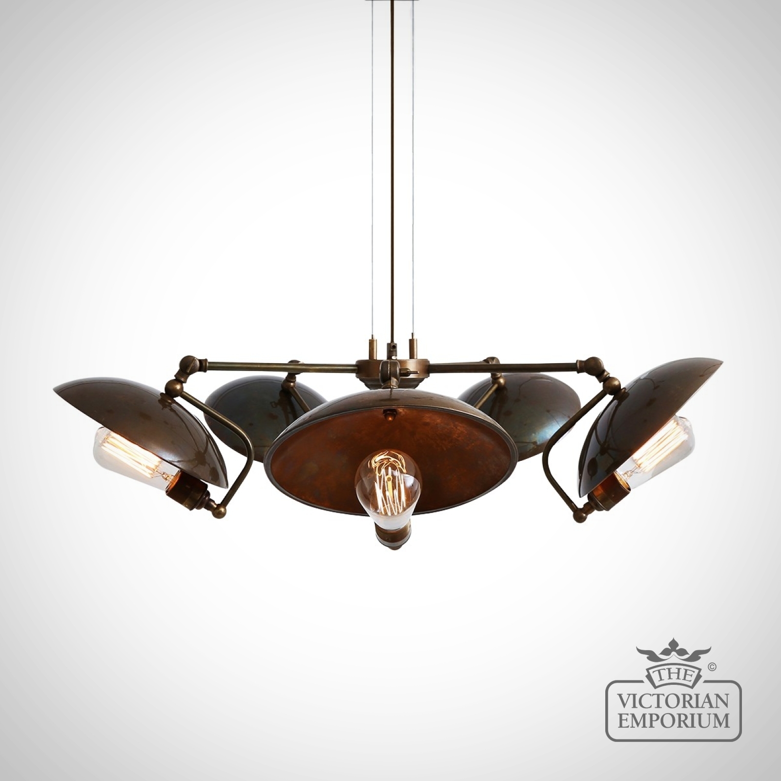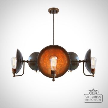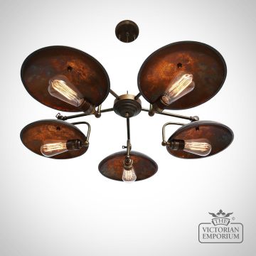 This 5 light chandelier is the perfect choice if you have a steampunk or industrial interior - it emanates warmth through its shadowed patinated back plate