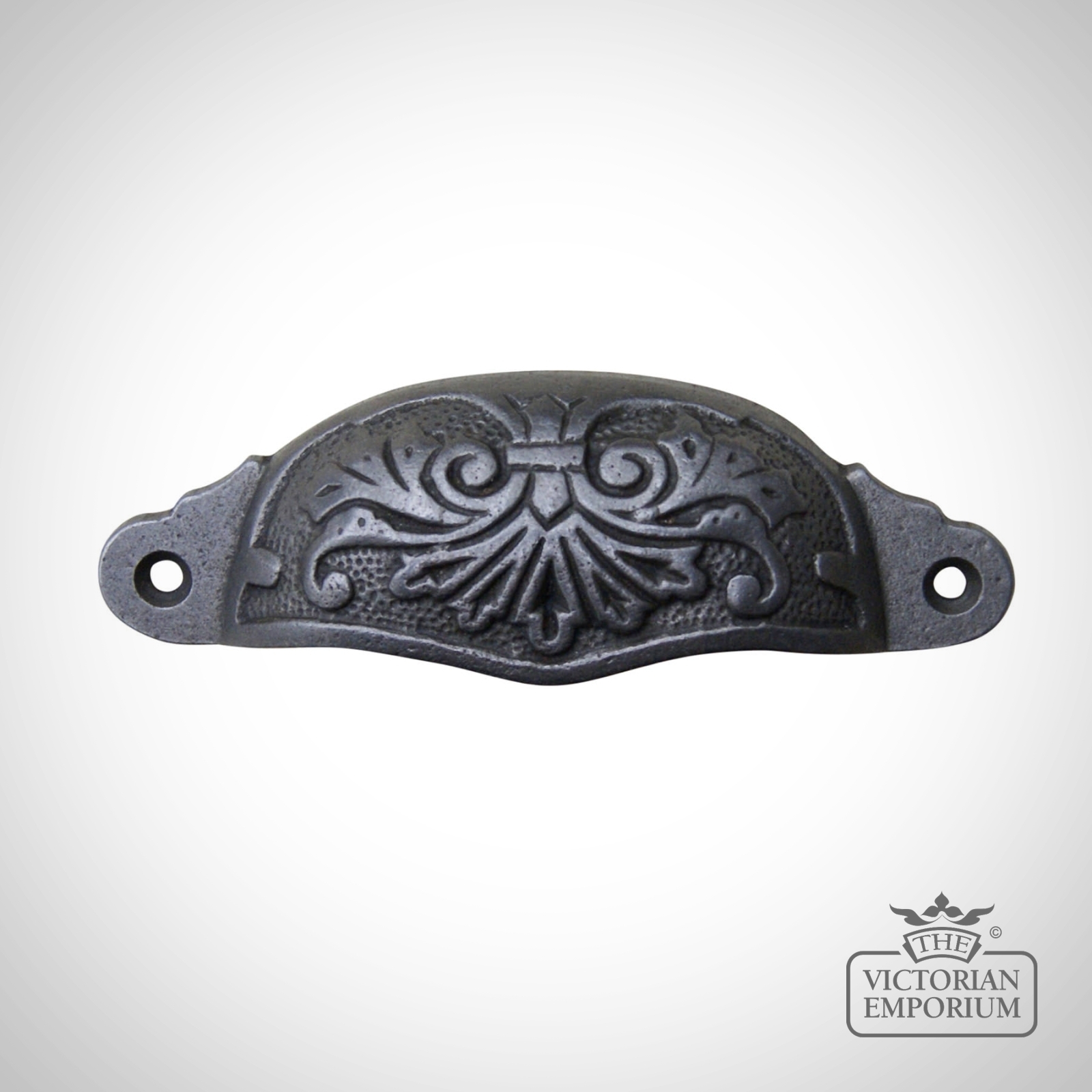 Stunning antique iron cup handle featuring Ornate Design which will enhance any period kitchen design. Can be used with complementary pull handles.