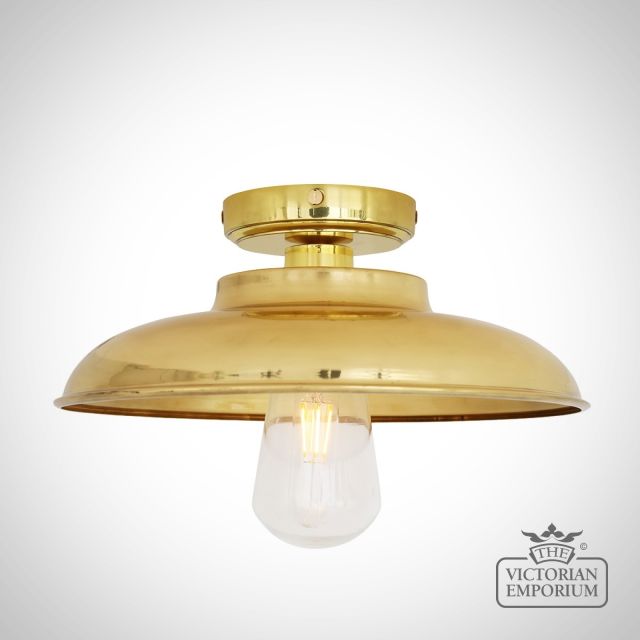 The Daria Bathroom Flush Mount Ceiling Light is an industrial-style ceiling light that features a shallow brass shade attached so a brass lamp holder and ceiling rose