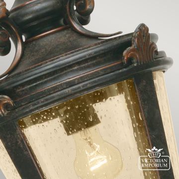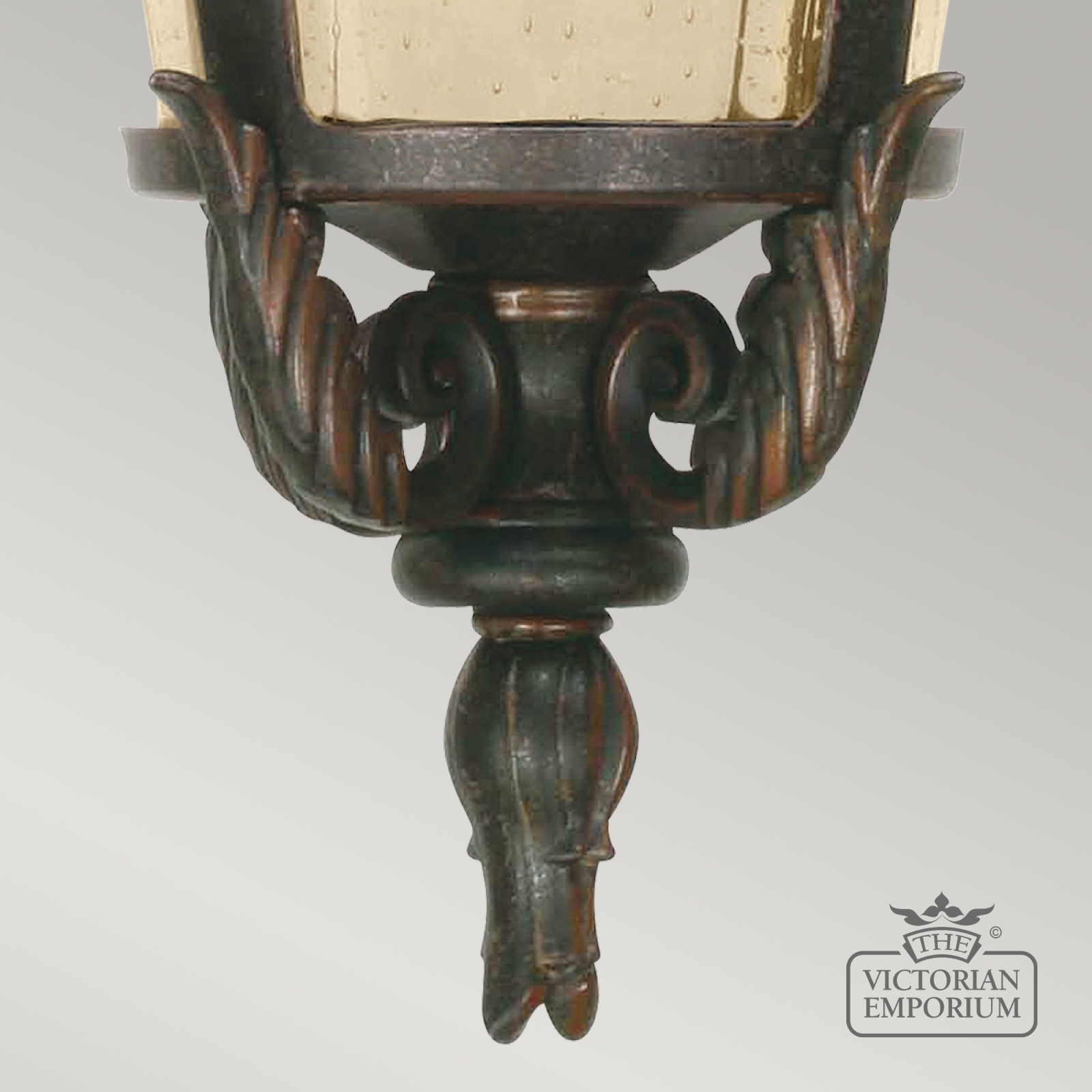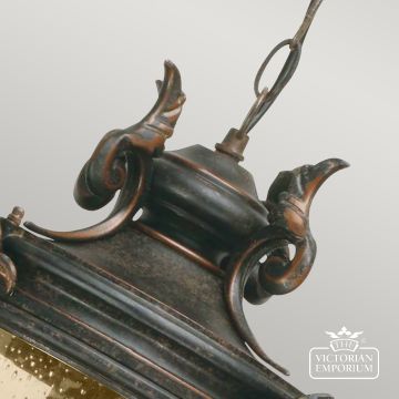 This period style pedestal lantern has amber tinted blown glass and is hand finished in a weather bronze patina.