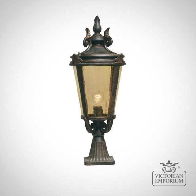 This period style pedestal lantern has amber tinted blown glass and is hand finished in a weather bronze patina.