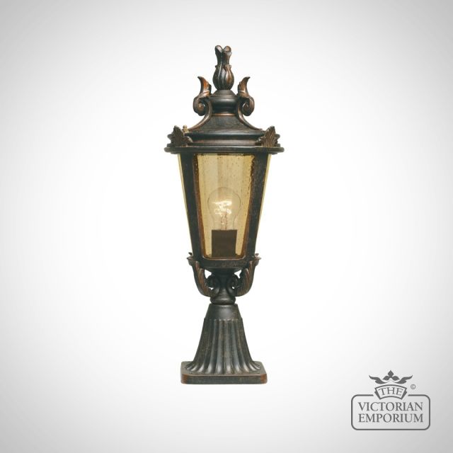 This period style pedestal lantern has amber tinted blown glass and is hand finished in a weather bronze patina.