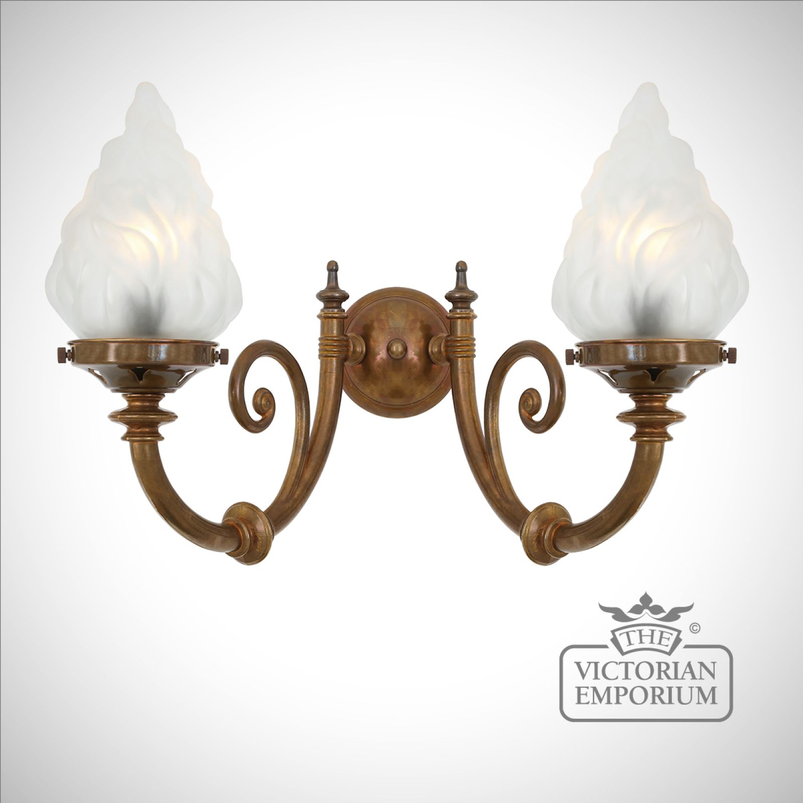 The Darwin two-arm wall light features two decorative curved arms and flame glass lamp shades giving it a truly period feel. The curved arms originate from a domed wall plate.