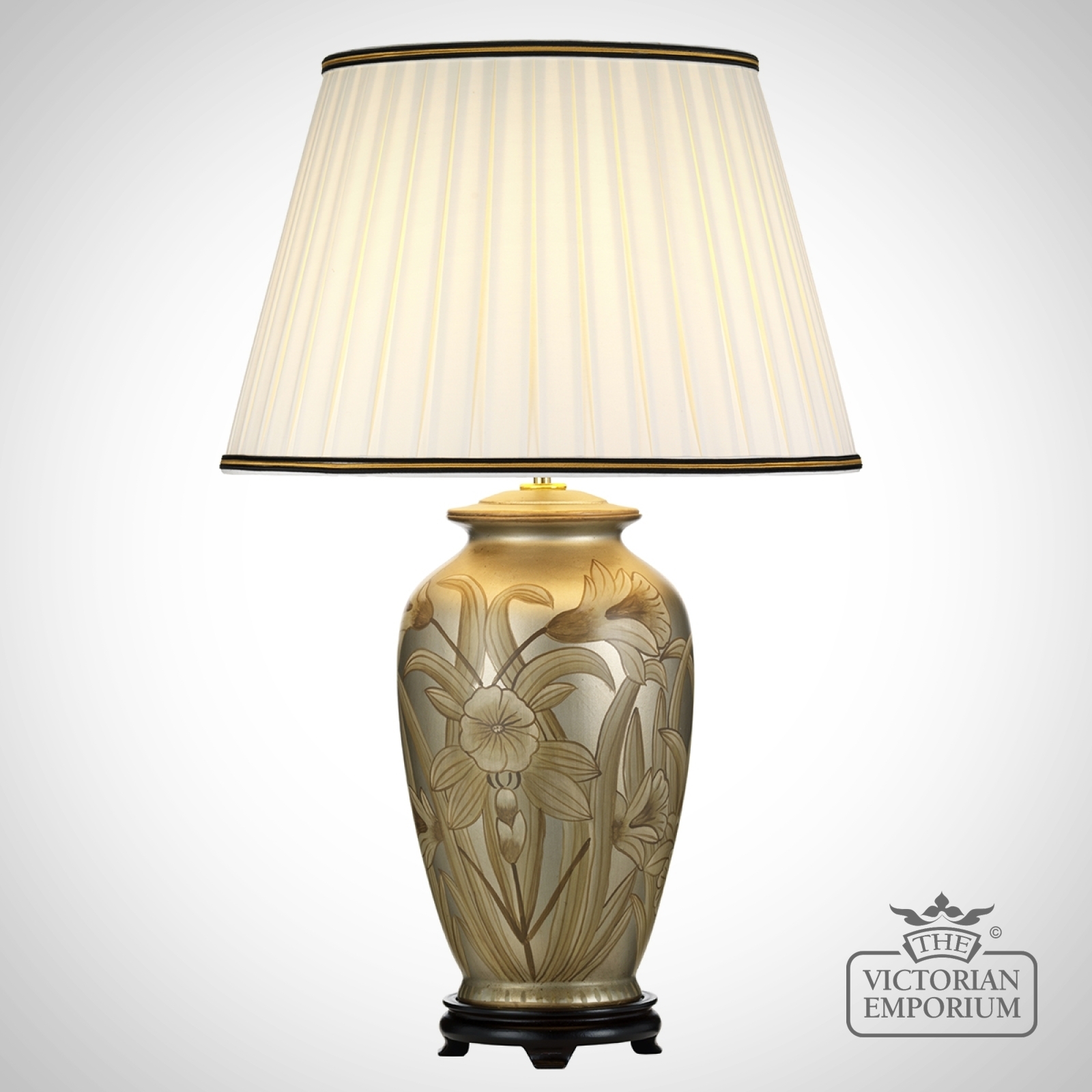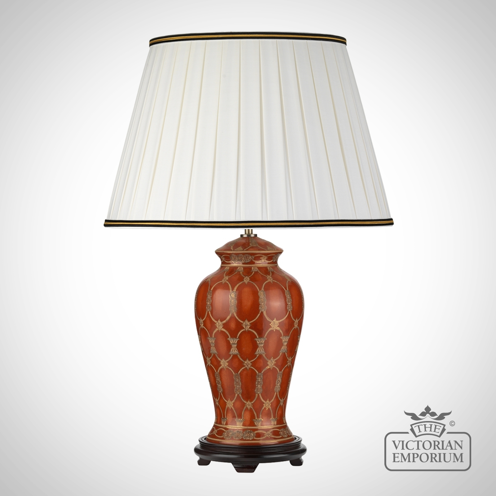 A traditional Terracotta oriental ceramic base with gold and brown décor. Including an Ivory 100% cotton, box pleat shade with black and gold trim.