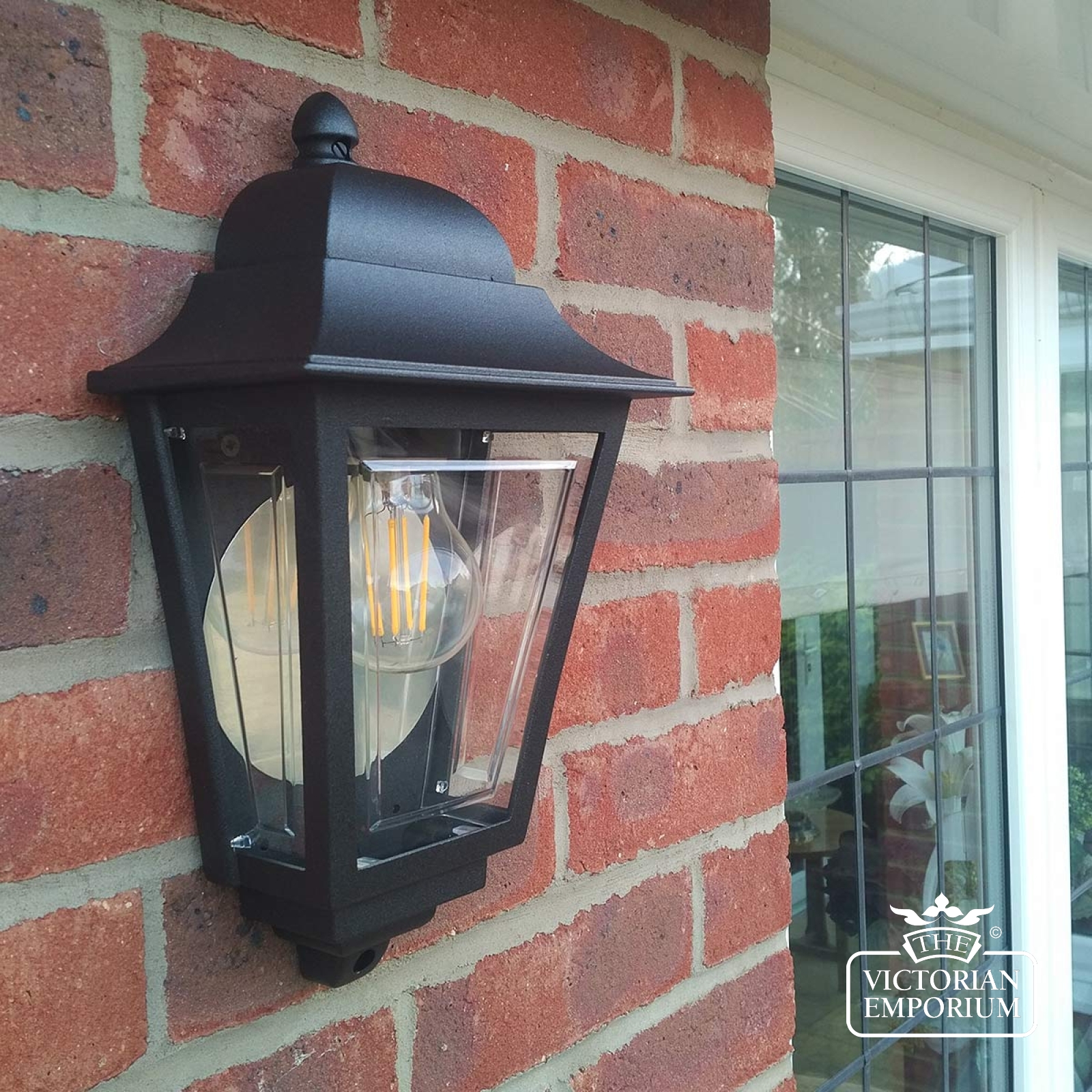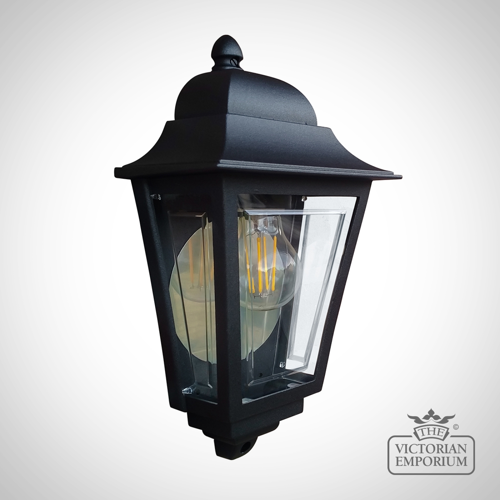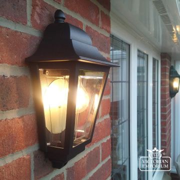 Half all lantern with a period silhouette in a choice of Victorian colours with clear polycarbonate and rated for outdoor use. Made from aluminium.