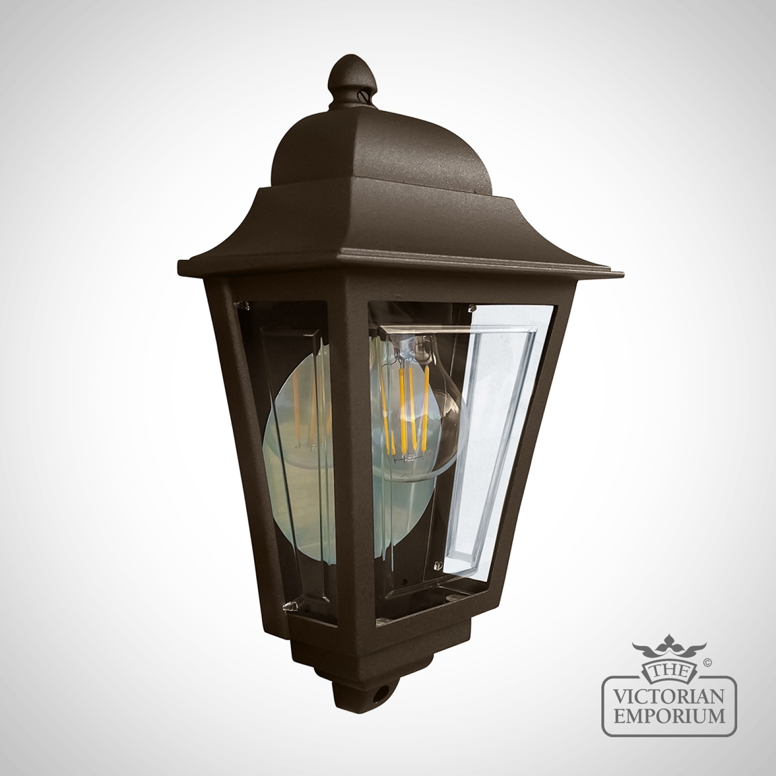 Half wall lantern with a period silhouette in a choice of Victorian colours with clear polycarbonate and rated for outdoor use. Made from aluminium.