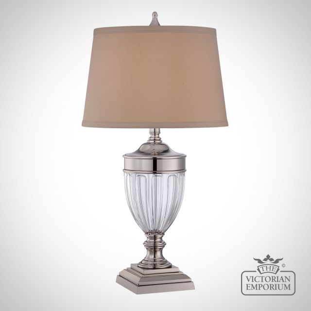 Glass and metal table lamp in Polished Nickel finish, including Tan hardback fabric shade with double trim..