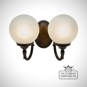 Elegant double globe wall light in antique bronze finish and with etched glass