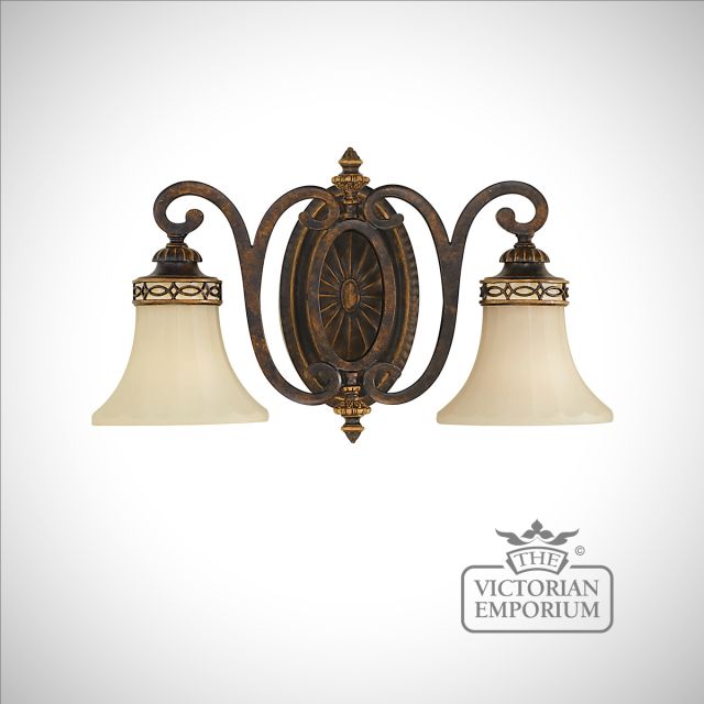 Wall sconce with two lights with walnut colour and glass shade. Matches our other Walnut finish lights