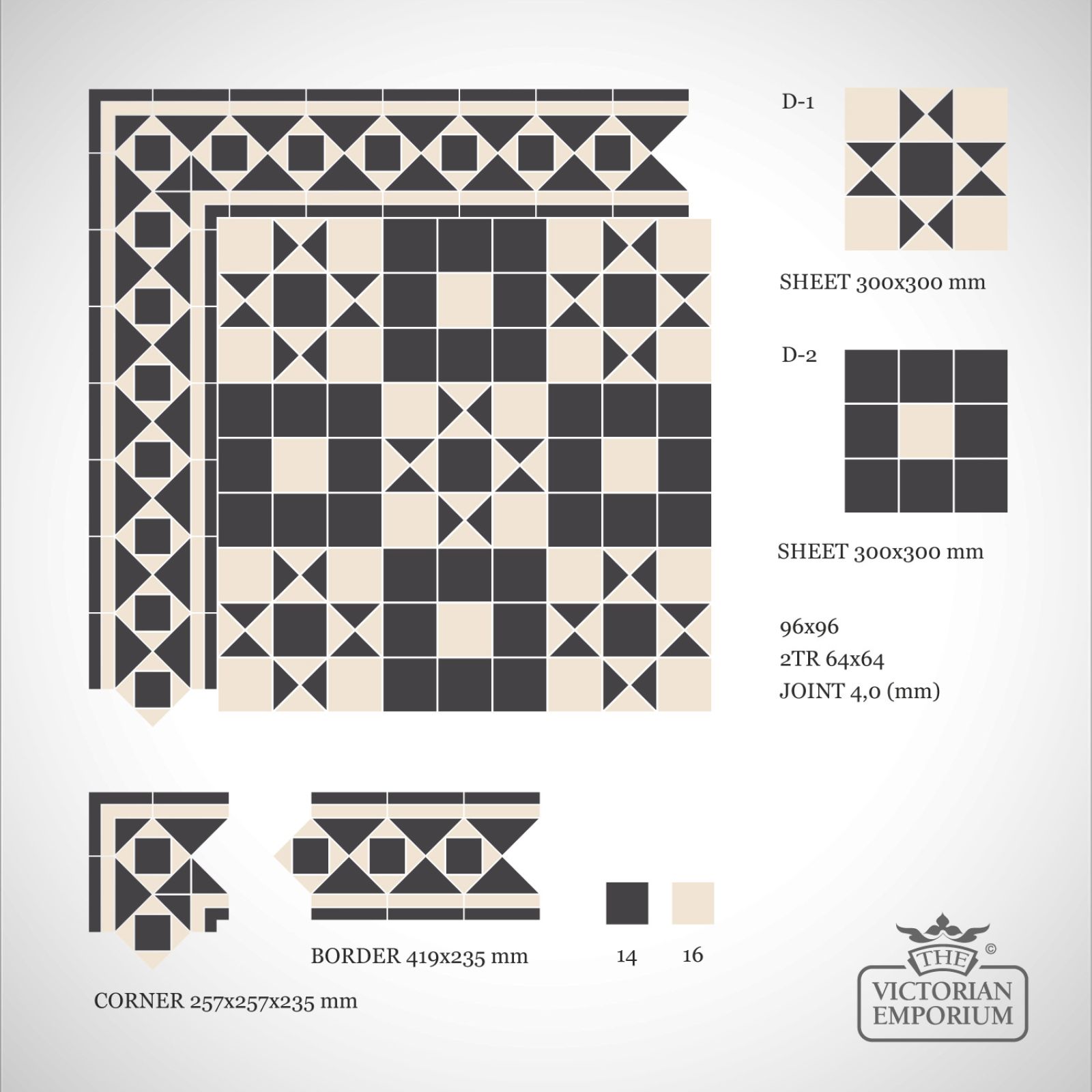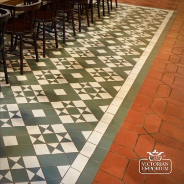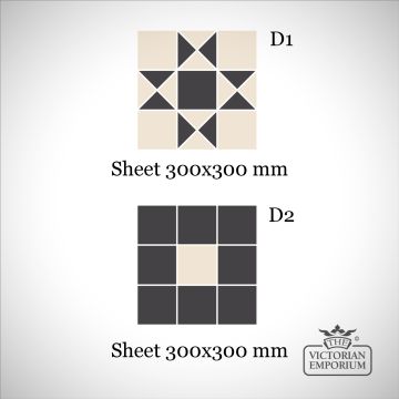Victorian mosaic pattern tiles in a Victorian colour pallet - sold by the sheet. Dover pattern inset tiles design match the Dover Border and Corner