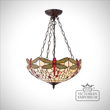 The medium inverted Dragonfly pendant in beige is a traditional interpretation of the iconic Tiffany Dragonfly design, in natural muted colours with coloured glass beading