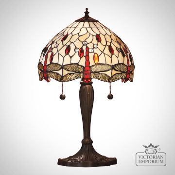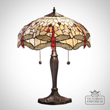 The Dragonfly table lamp in beige is a traditional interpretation of the iconic Tiffany Dragonfly design, in natural muted colours with coloured glass beading and teamed with a dark bronze effect fitting