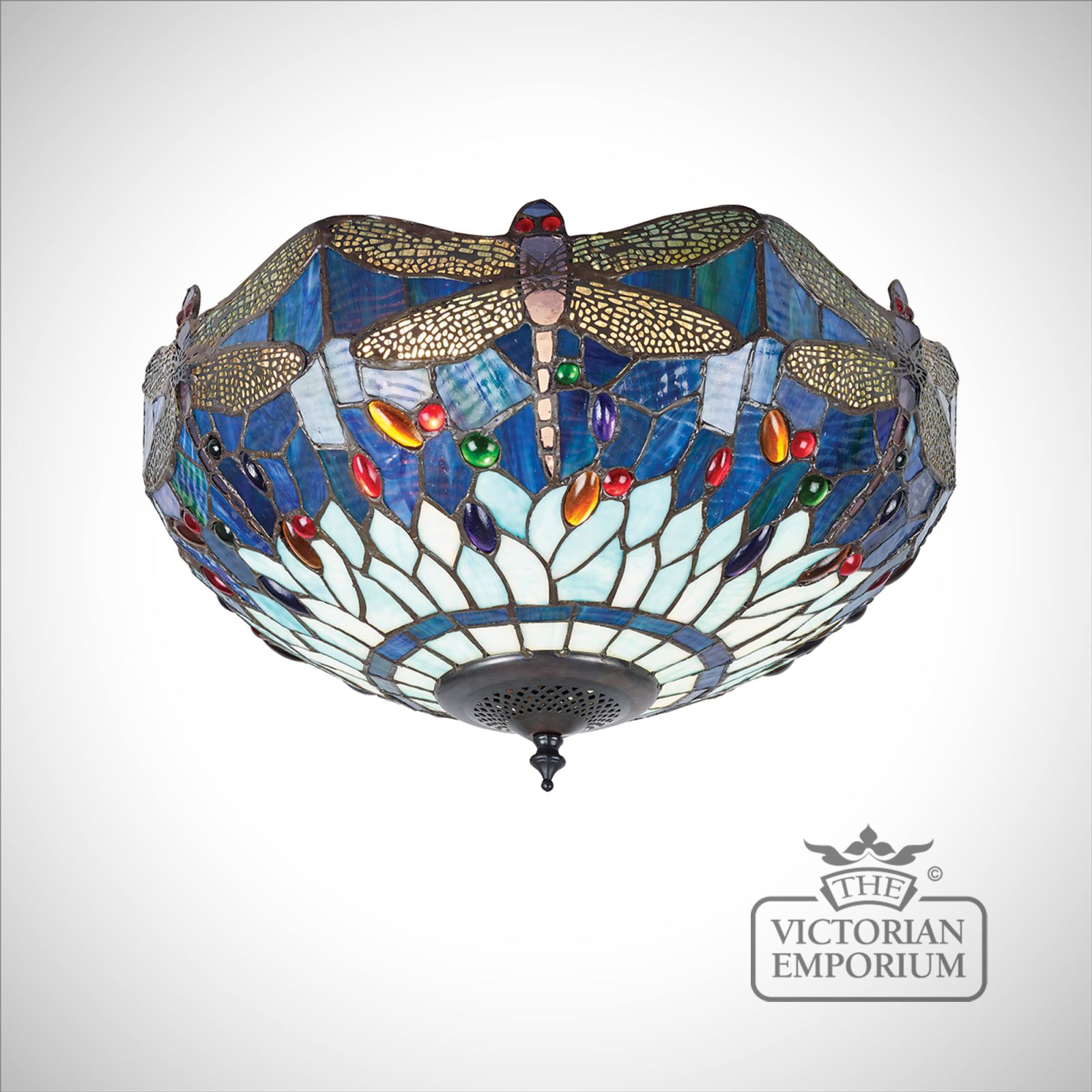 A stunning flush ceiling light with the iconic Tiffany Dragonfly design in a vivid blues with multi coloured glass beading. Teamed with a dark bronze effect fitting