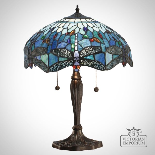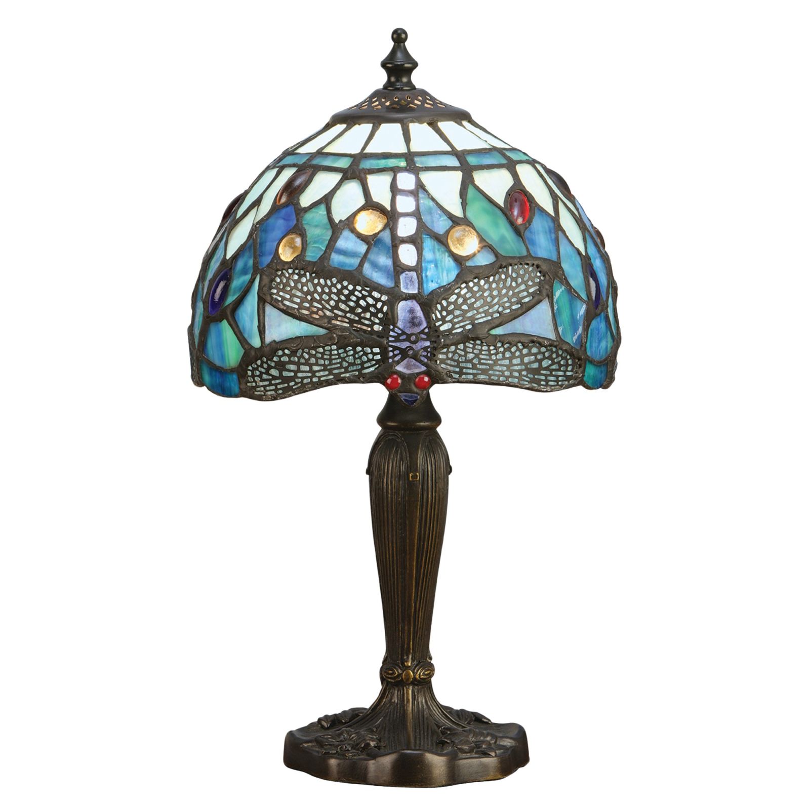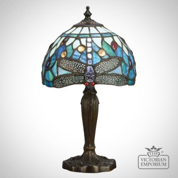 A stunning small table light with the iconic Tiffany Dragonfly design in a vivid blues with multi coloured glass beading