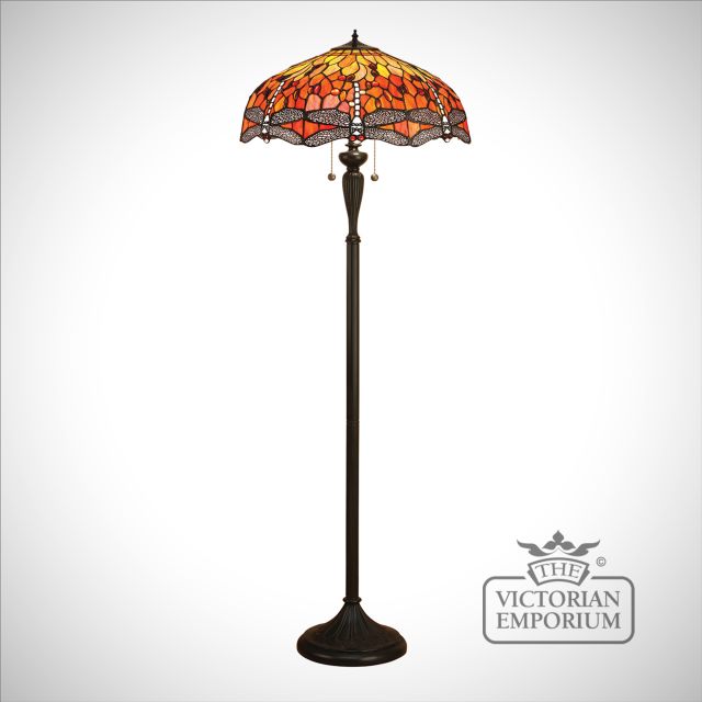 A stunning floor lamp with the iconic Tiffany Dragonfly design, in a vibrant reds and oranges with multi coloured glass beading and teamed with a dark bronze effect fitting