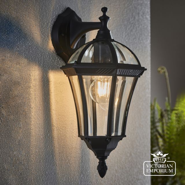 A traditional die cast aluminium wall lantern with a matt black finish. It is IP44 rated so is suitable for outdoor use, and both dimmable and suitable for use with LED lamps.