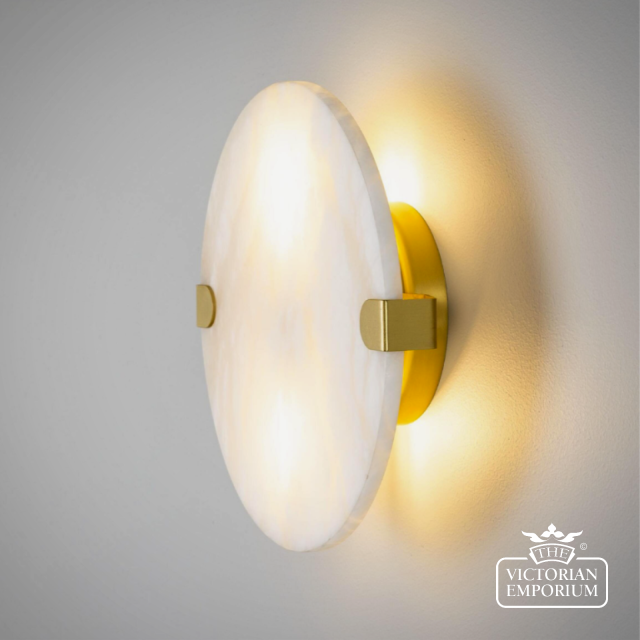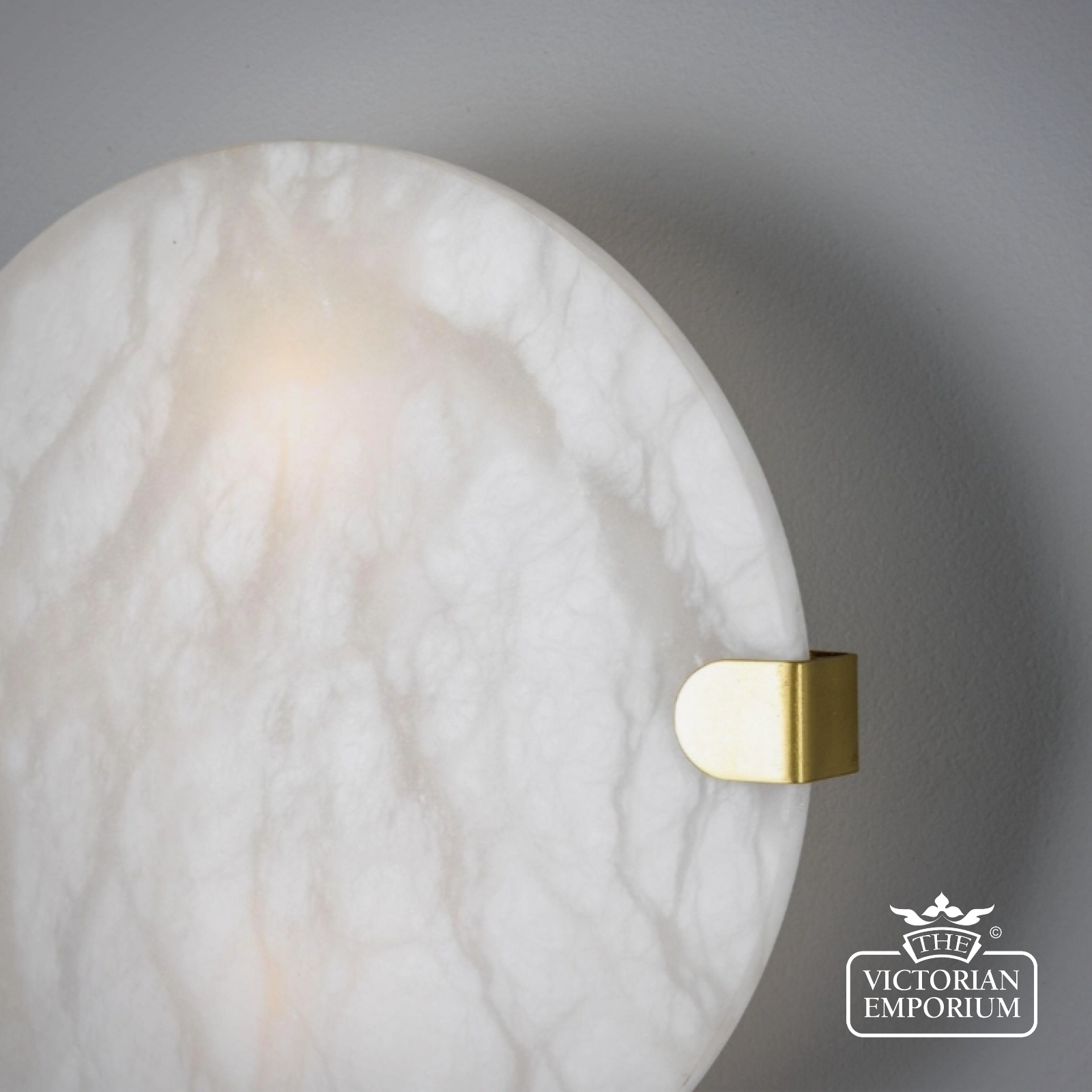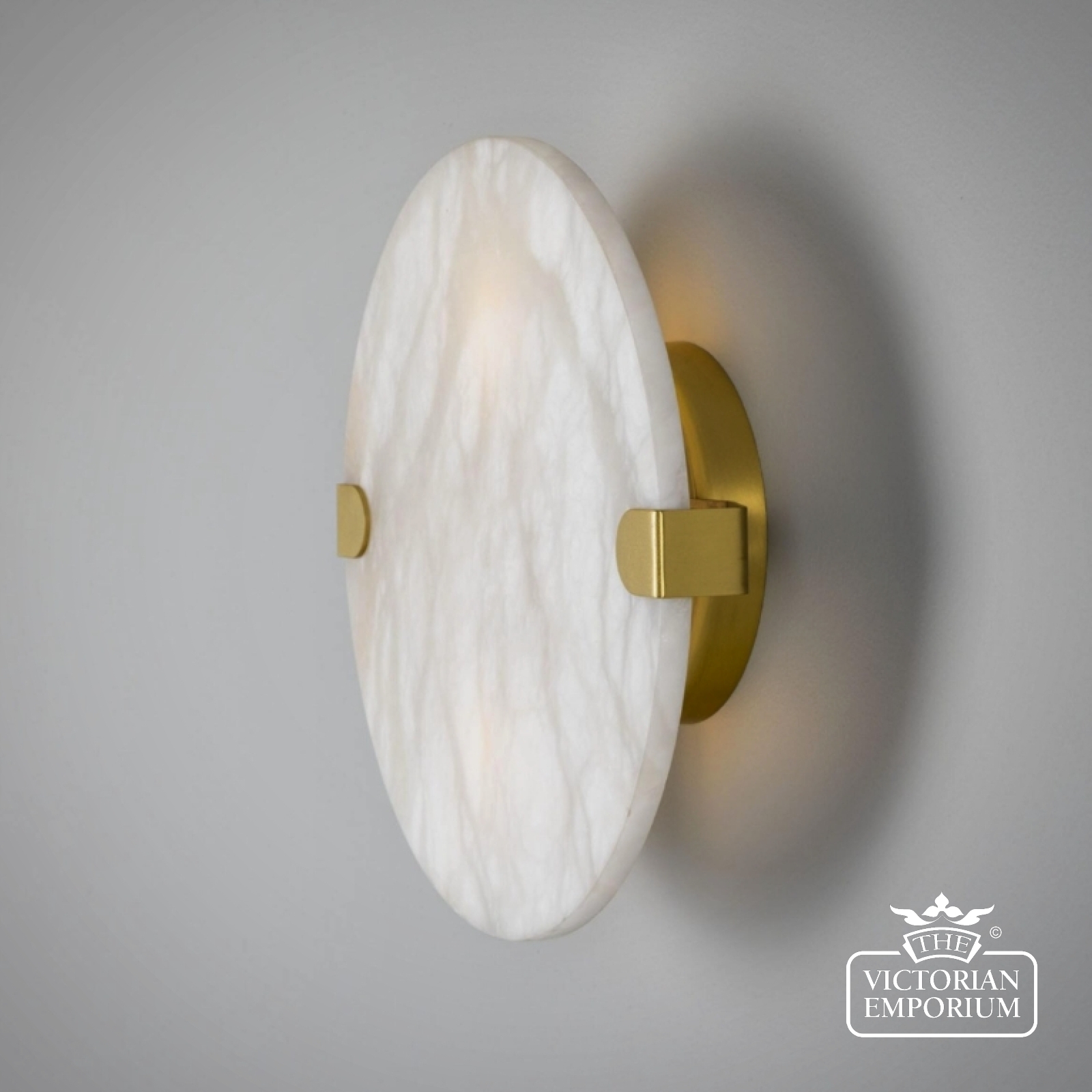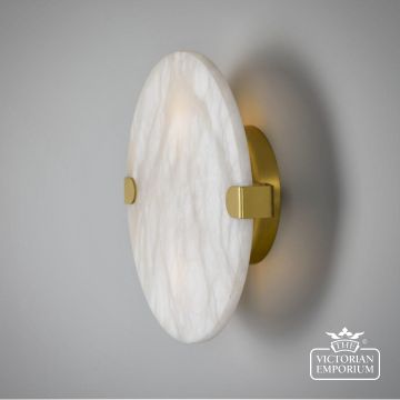 The Dundee Circular Wall Light features a round stone shade which emits a gentle, even glow, while subtle veining of the alabaster gives each one a natural individuality.