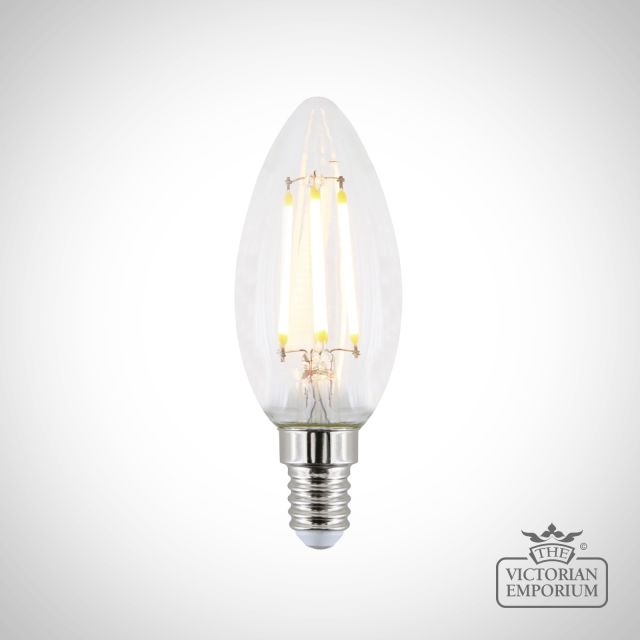 The LED filament inside this LED candle bulb resembles Edison-style light bulbs and has a small screw cap fitting standard E14 lamp holders.