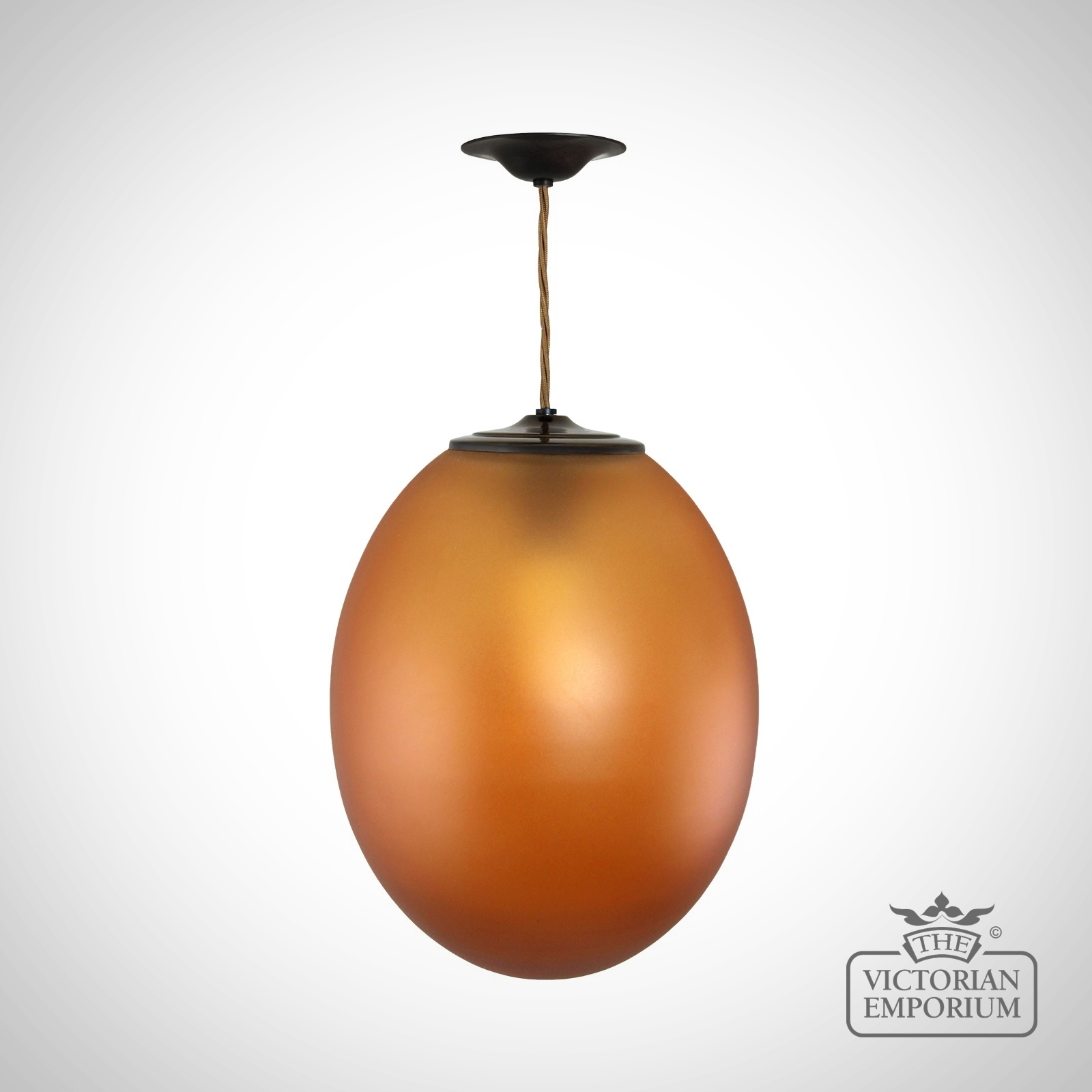 This is an egg shaped pendant with a hand blown glass shade in a choice of clear, etched or amber glass