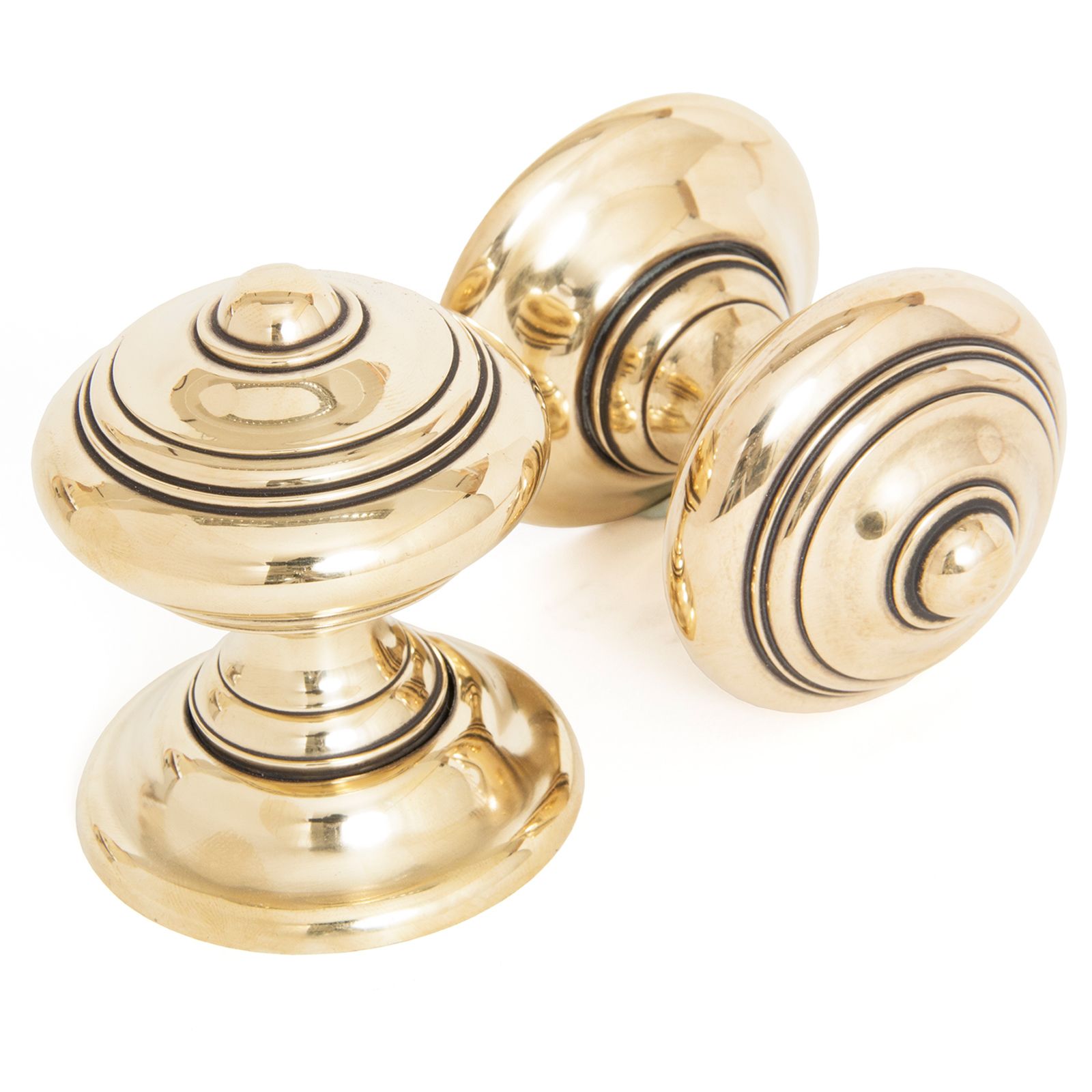 A concealed set of unsprung solid mortice knobs, reproduced from a classic Regency design. This door knob is screwed to the door with a concealed baseplate, finished with a threaded brass rose that conceals all fixing screws. The unlaquered brass is highly polished although these knobs will tarnish in time as part of the ageing process but can be polished if you want to achieve a high sheen.