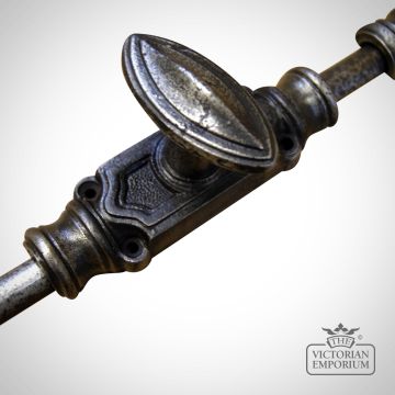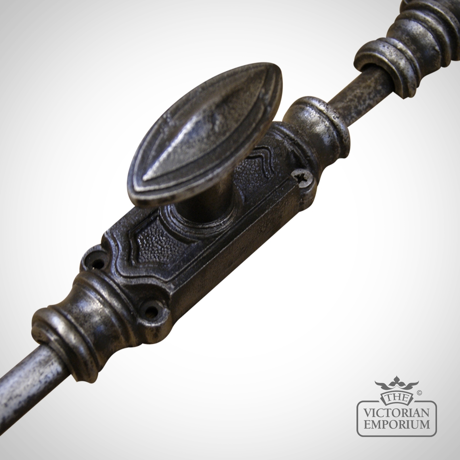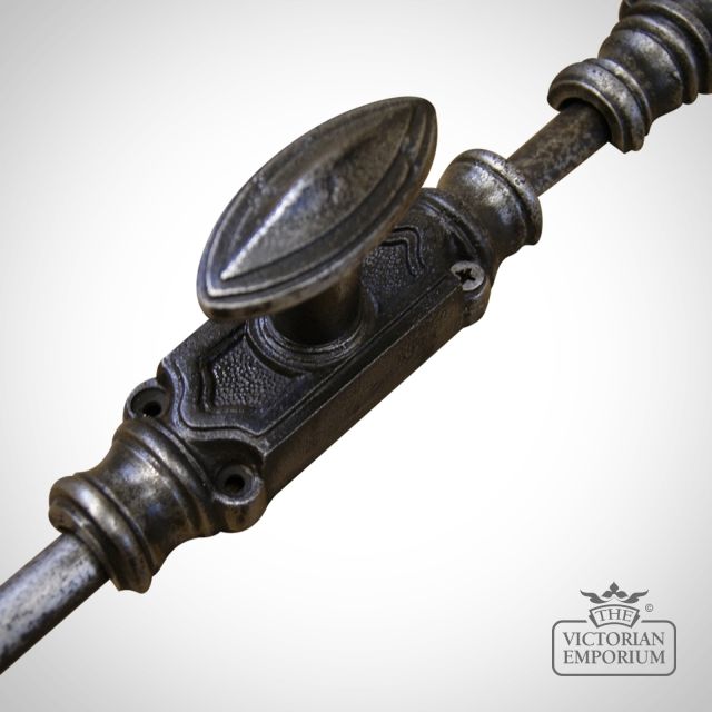 Decorative black iron espagnolette handles, guides and rods for windows and doors