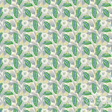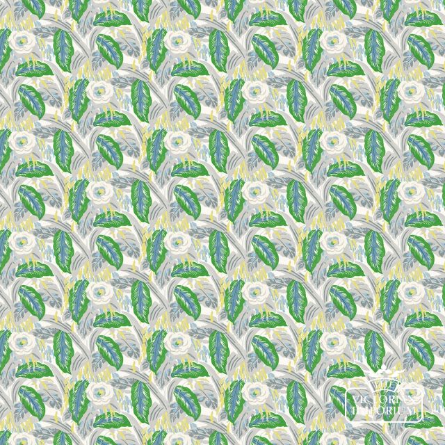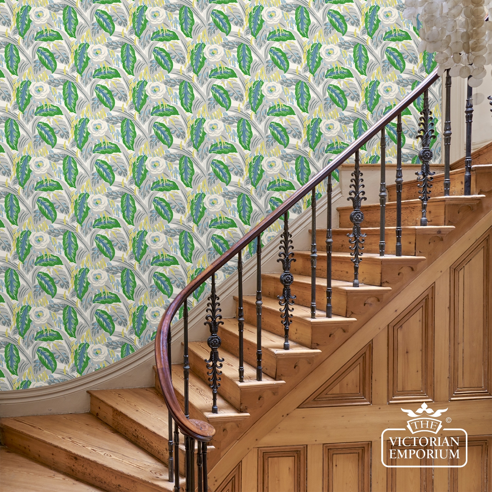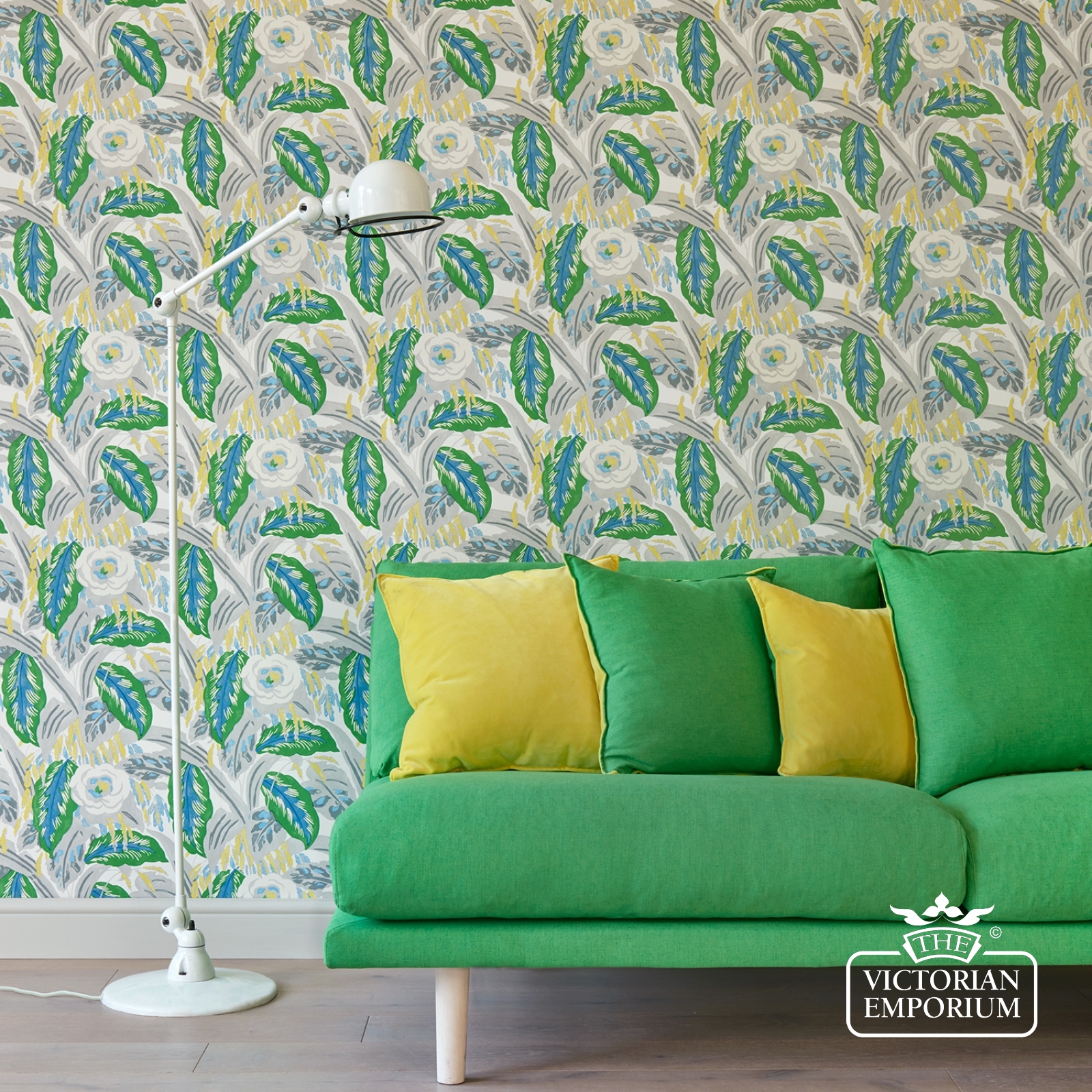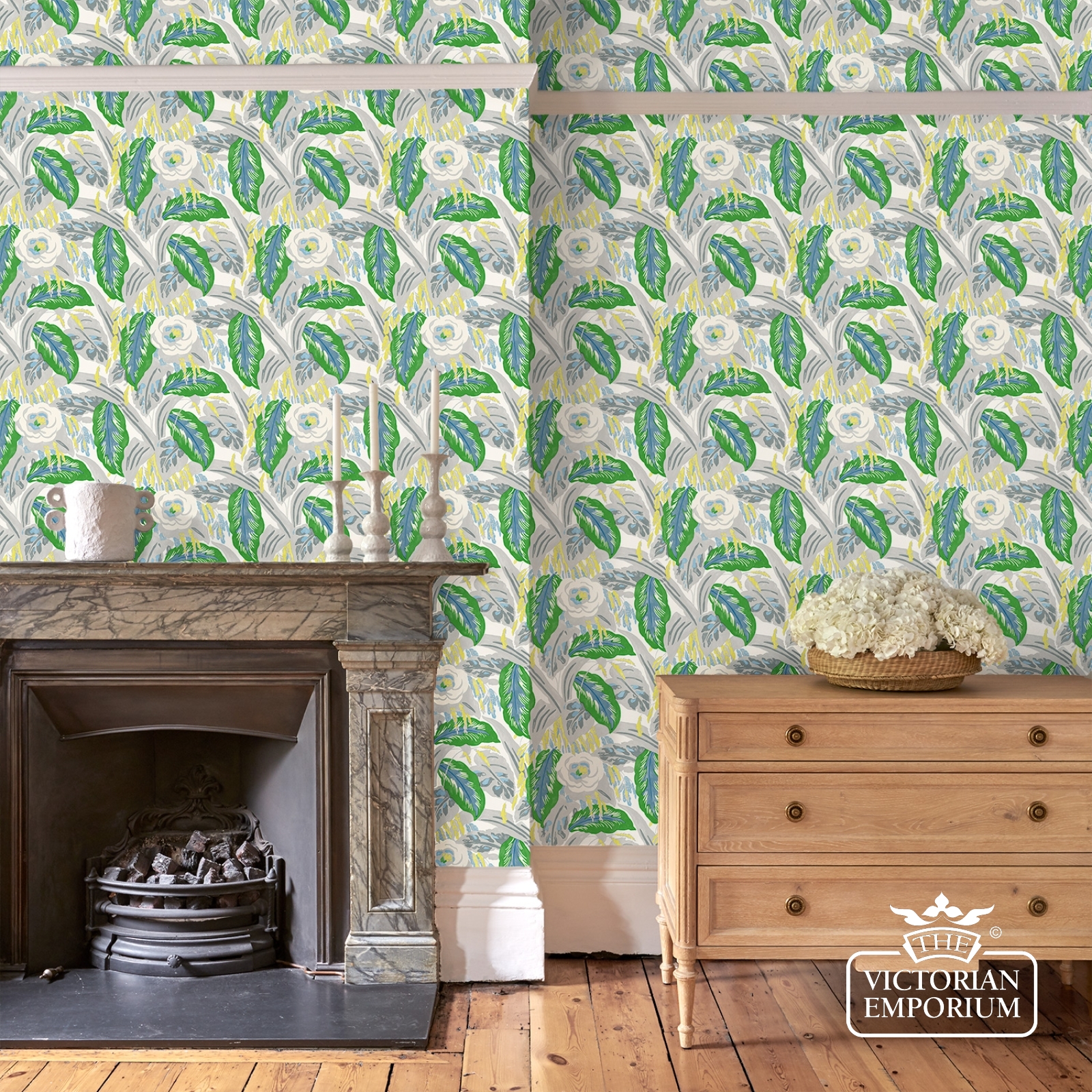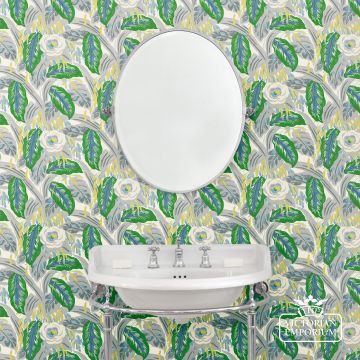 Taking inspiration from the wild brush strokes of a Fauvist painting, this wallpaper depicts lush, interlocking leaves and flowers in a fresh, Scandi-inspired colour palette.