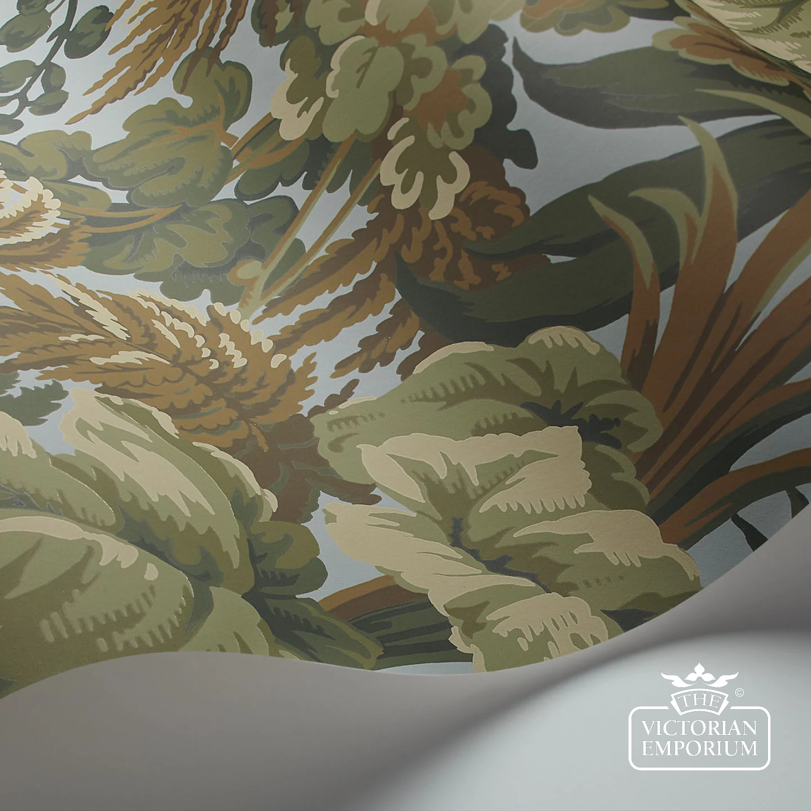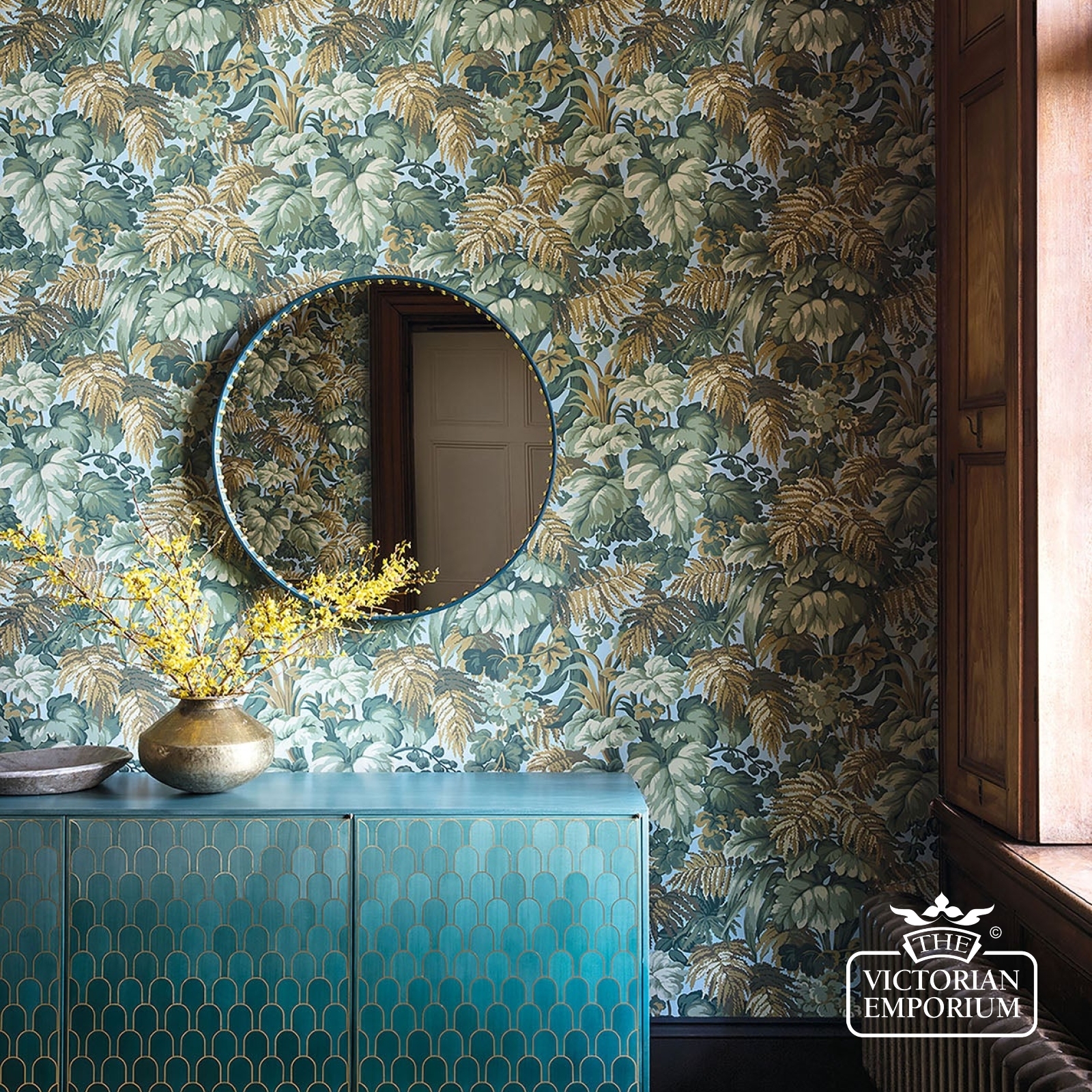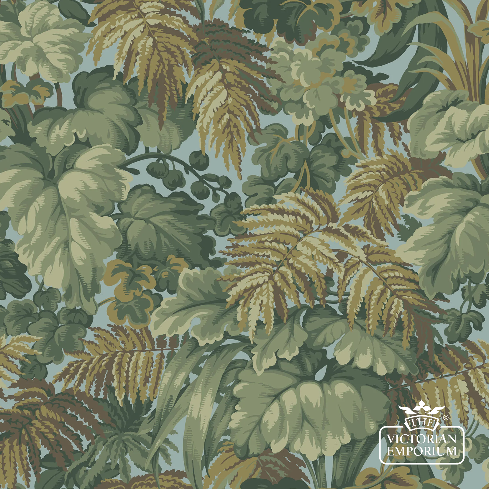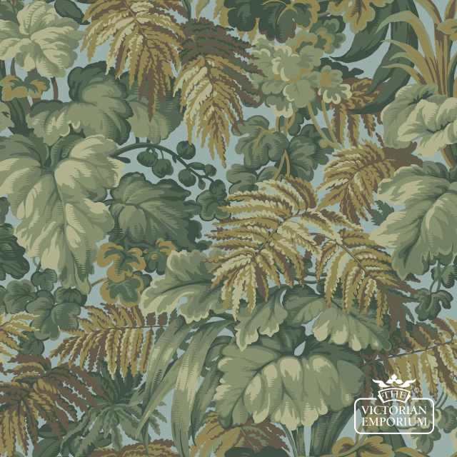 Inspired by the Majorelle Gardens in Marrakesh, Fernery is a lush motif of abundant leaves printed in chalky, matt palettes of Khaki and Print Room Blue, Forest Green, Warm Grey, and the soft yet arresting Slate Blue and Blush Pink.