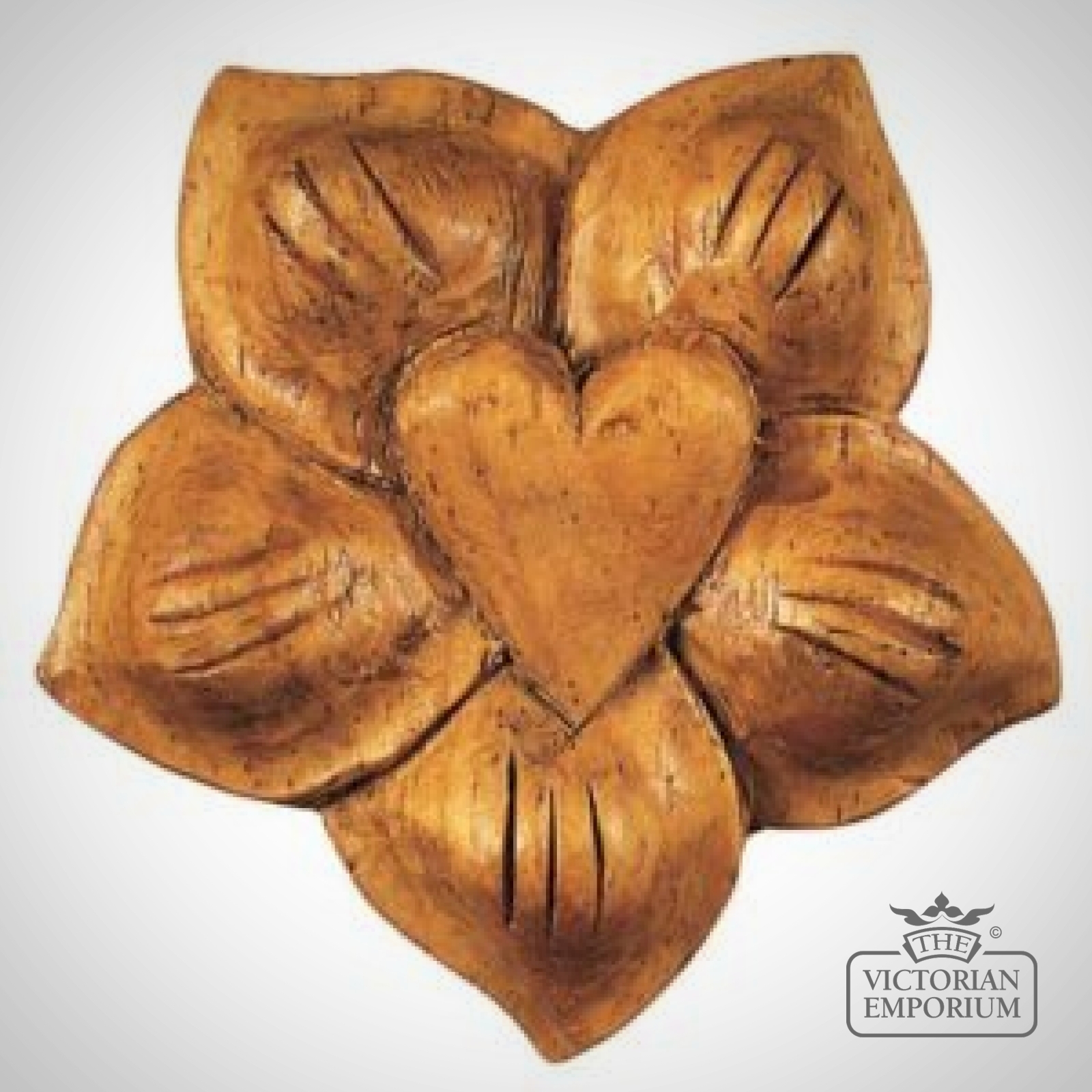 Beautiful decorative hand carved flower with heart to be used as a decorative moulding in a variety of projects.