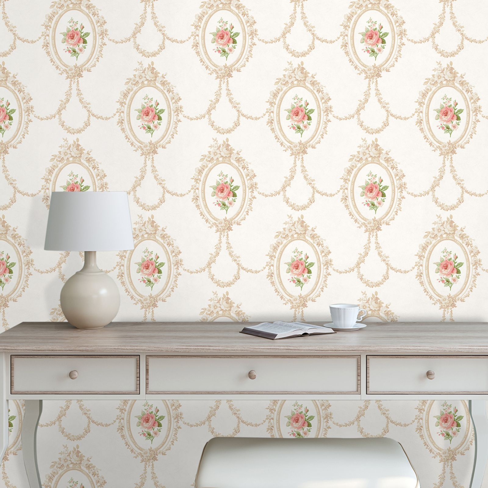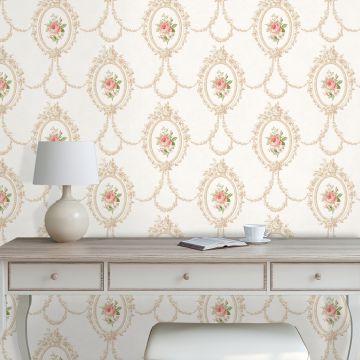 A pretty wallpaper featuring colourful flowers in an oval frame. This design would be suitable for a hallway, bedroom or bathroom.  A choice of pink or off white backgrounds.