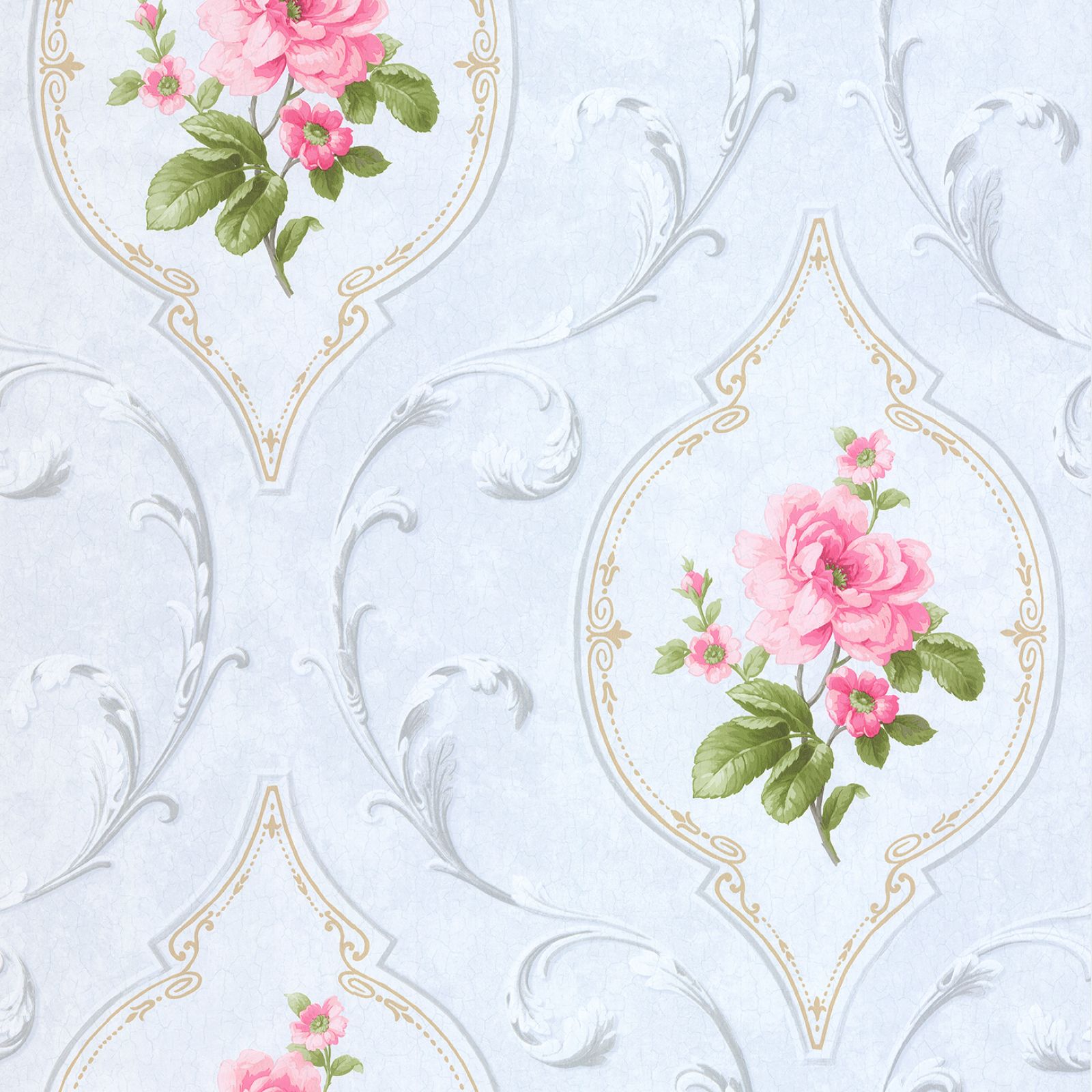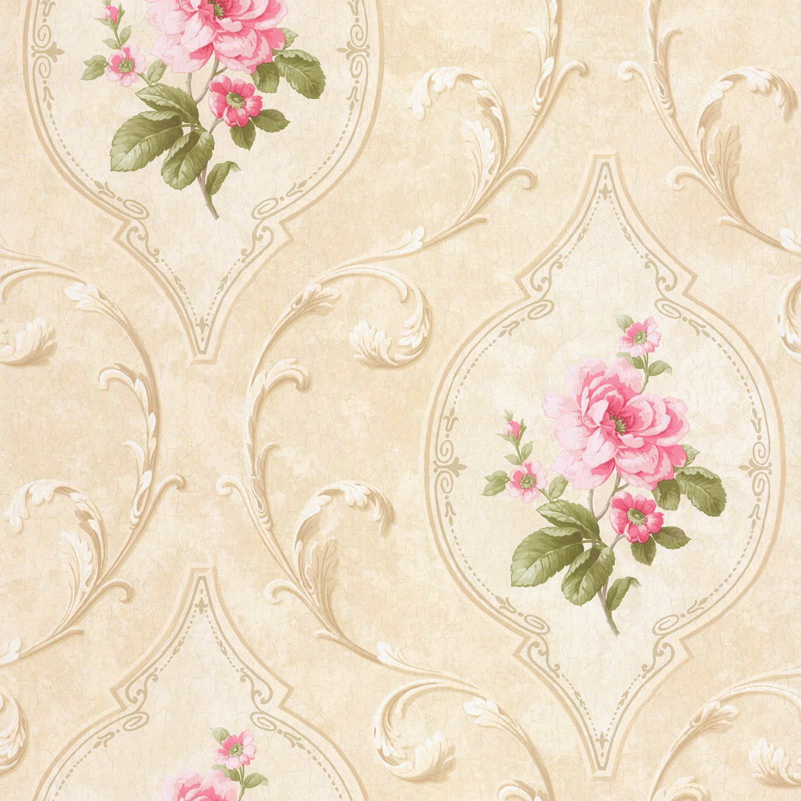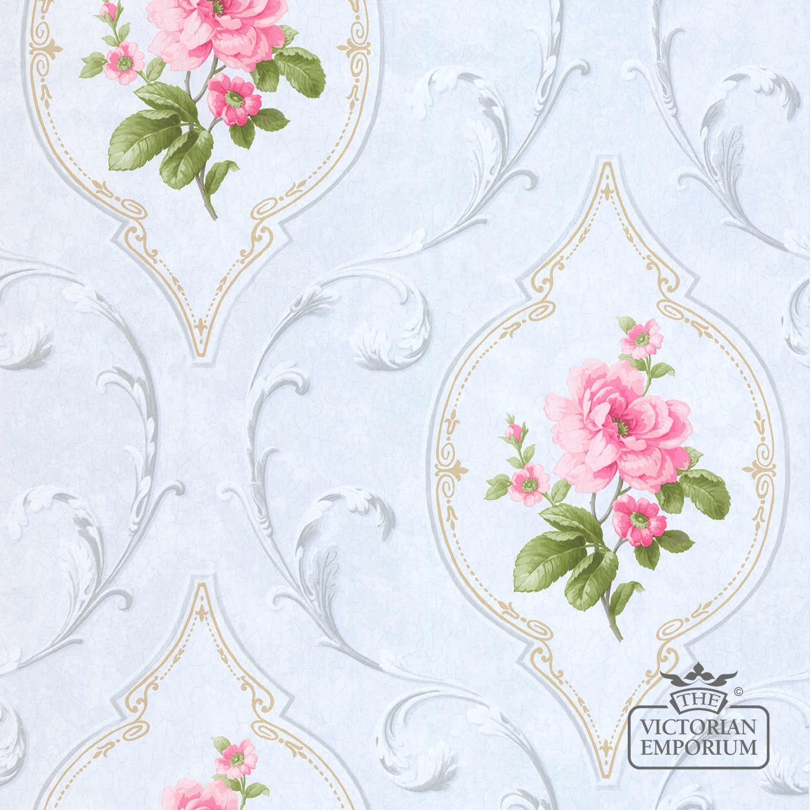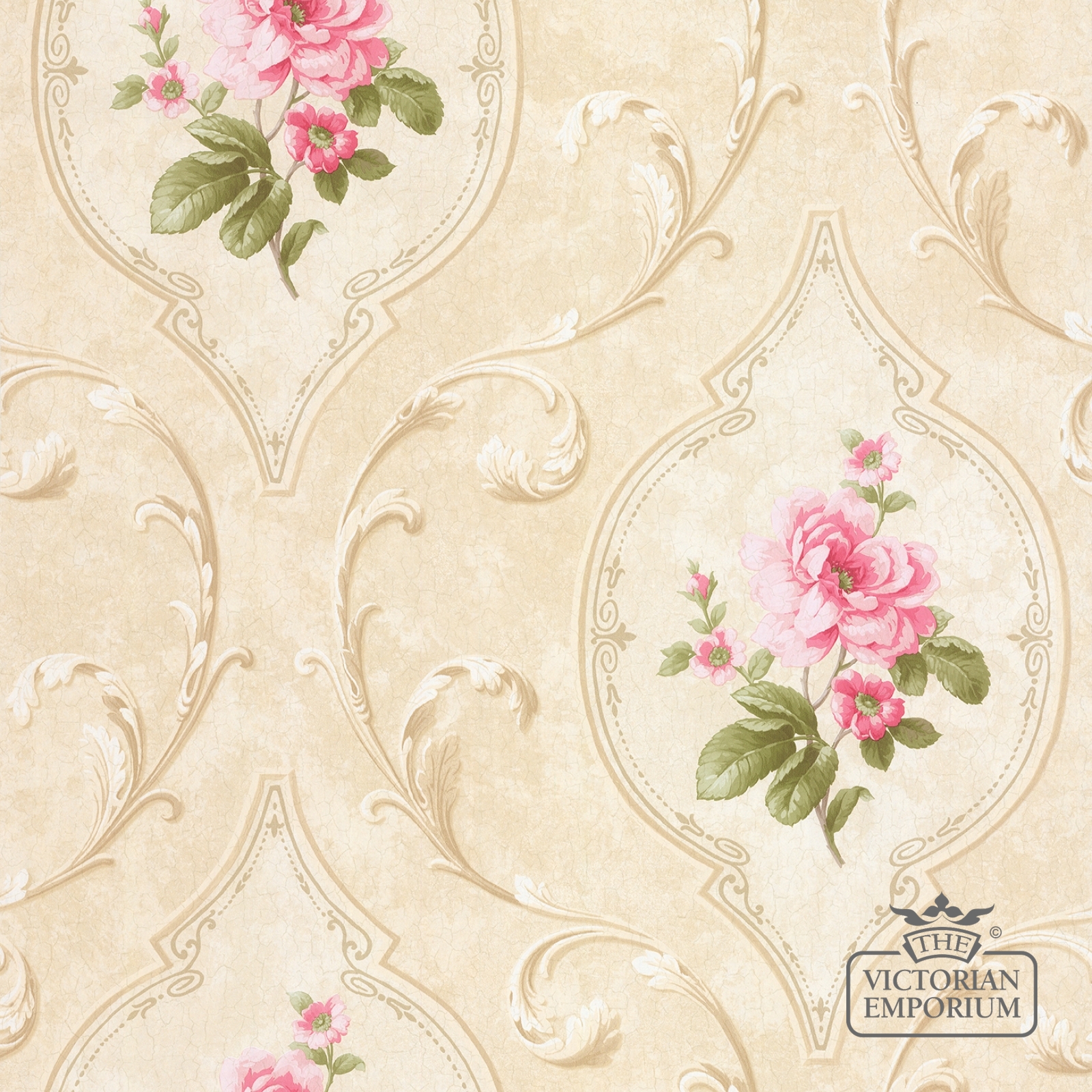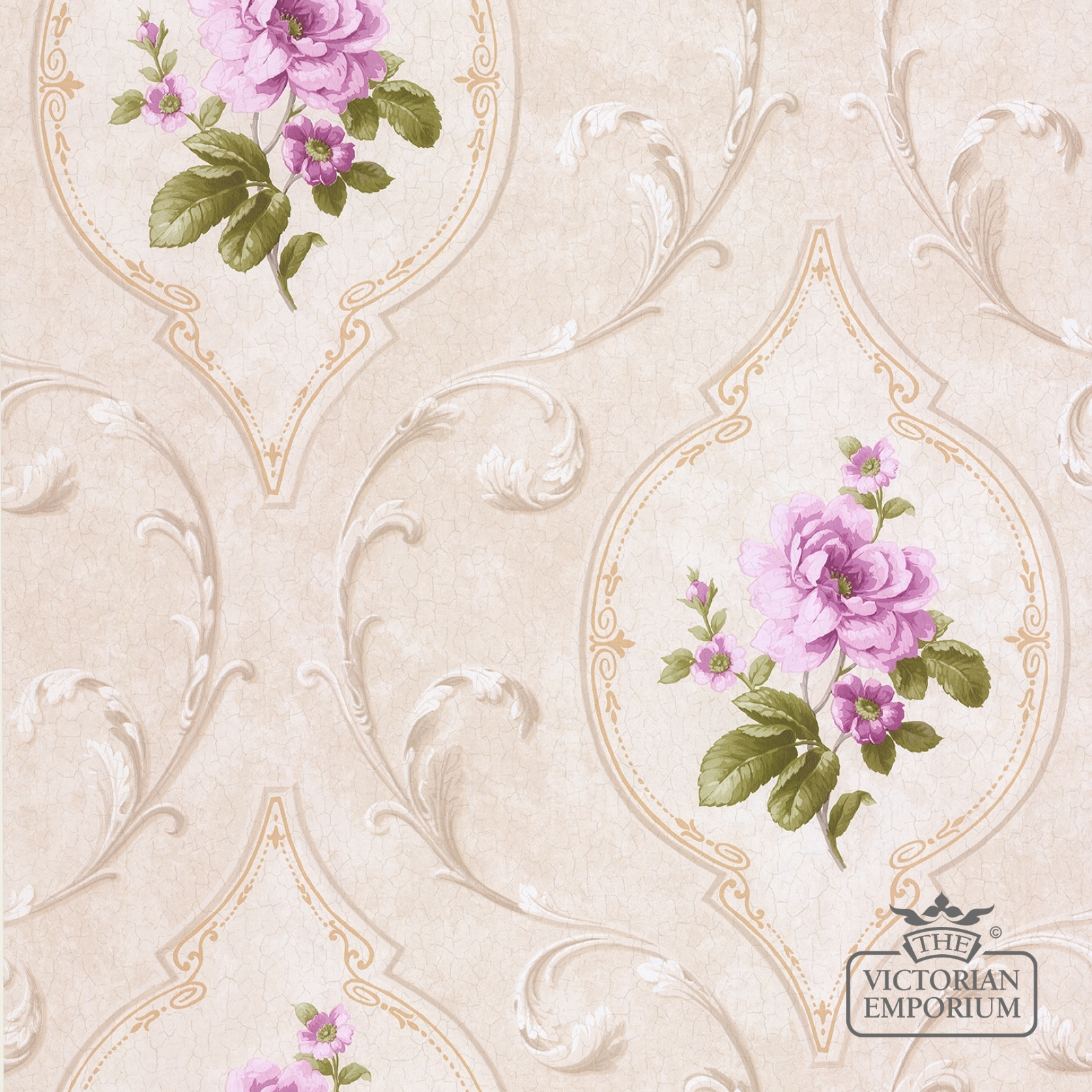 A pretty wallpaper featuring colourful flowers in an elegant pointed frame. This design would be suitable for a hallway, bedroom or bathroom. A choice of pink or off white backgrounds.