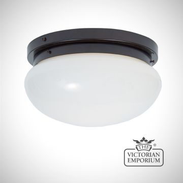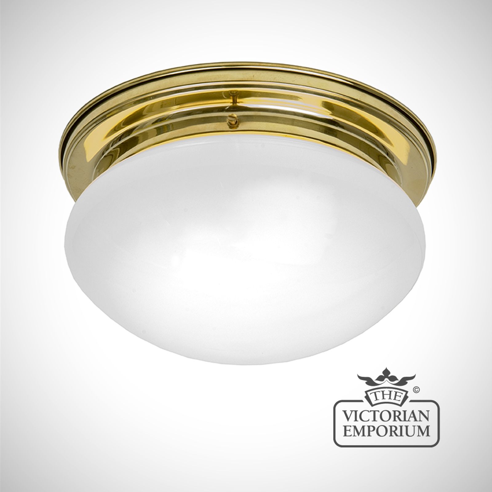 This simple bowl shaped flush mount light is available with brass or bronze metalwork