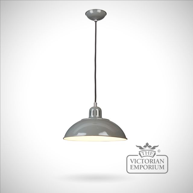This is a retro diner pendant suspended from a black flex cord in a choice of 4 colours - grey, cream, red and green