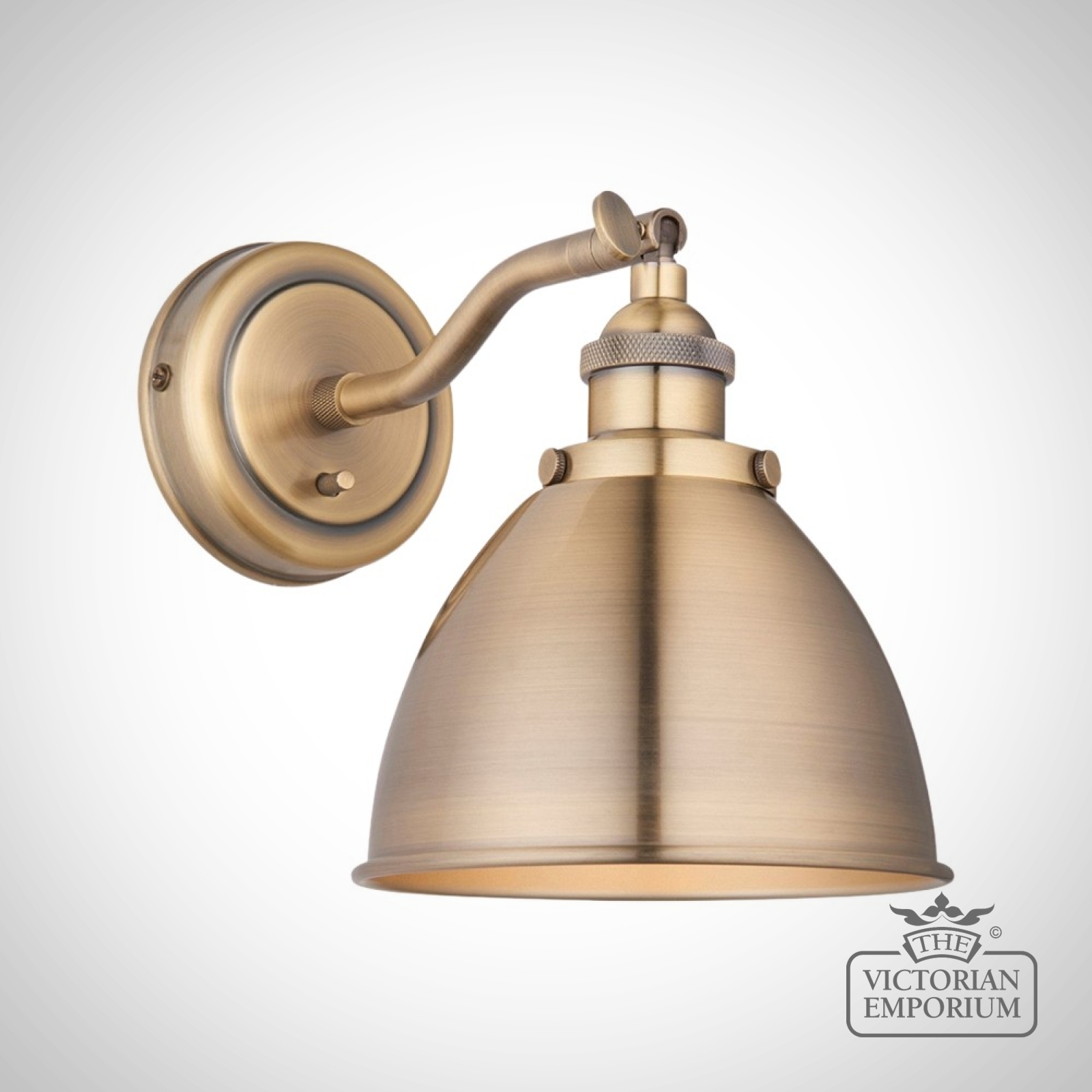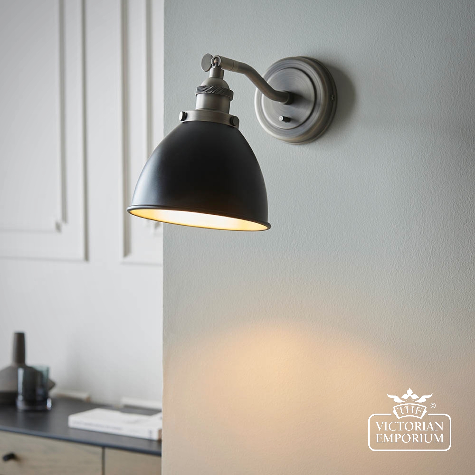 An authentic ‘restaurant’ style wall light, finished in matt black paint with aged pewter plated details or in antique brass.