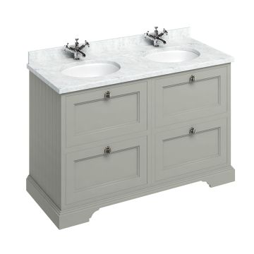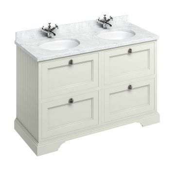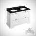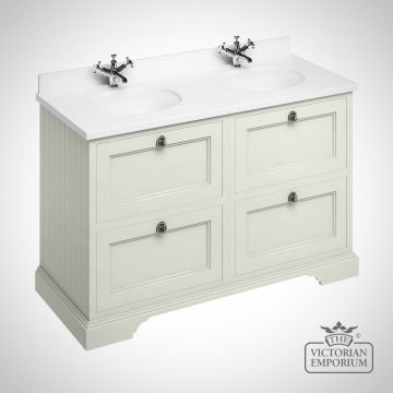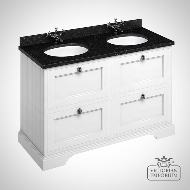 Freestanding 130cm wide Vanity Unit with 4 drawers with stone worktop and two fully inset basins - a choice of 4 colours for the unit and Black granite, plain white or white marble effect for the worktop