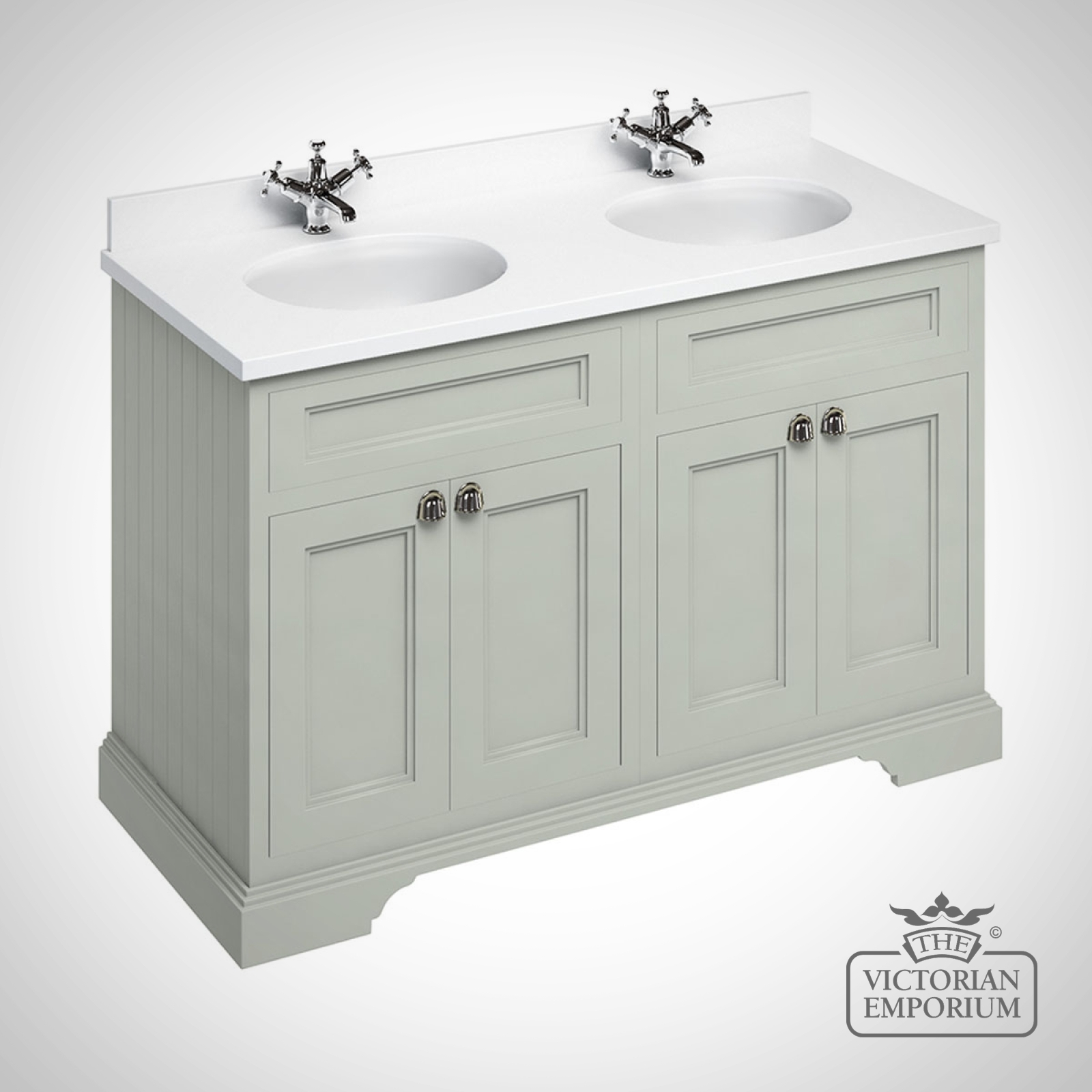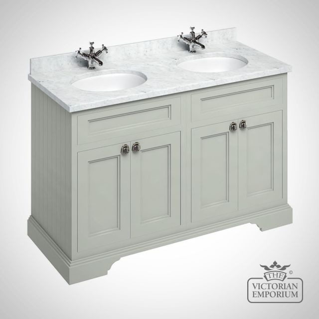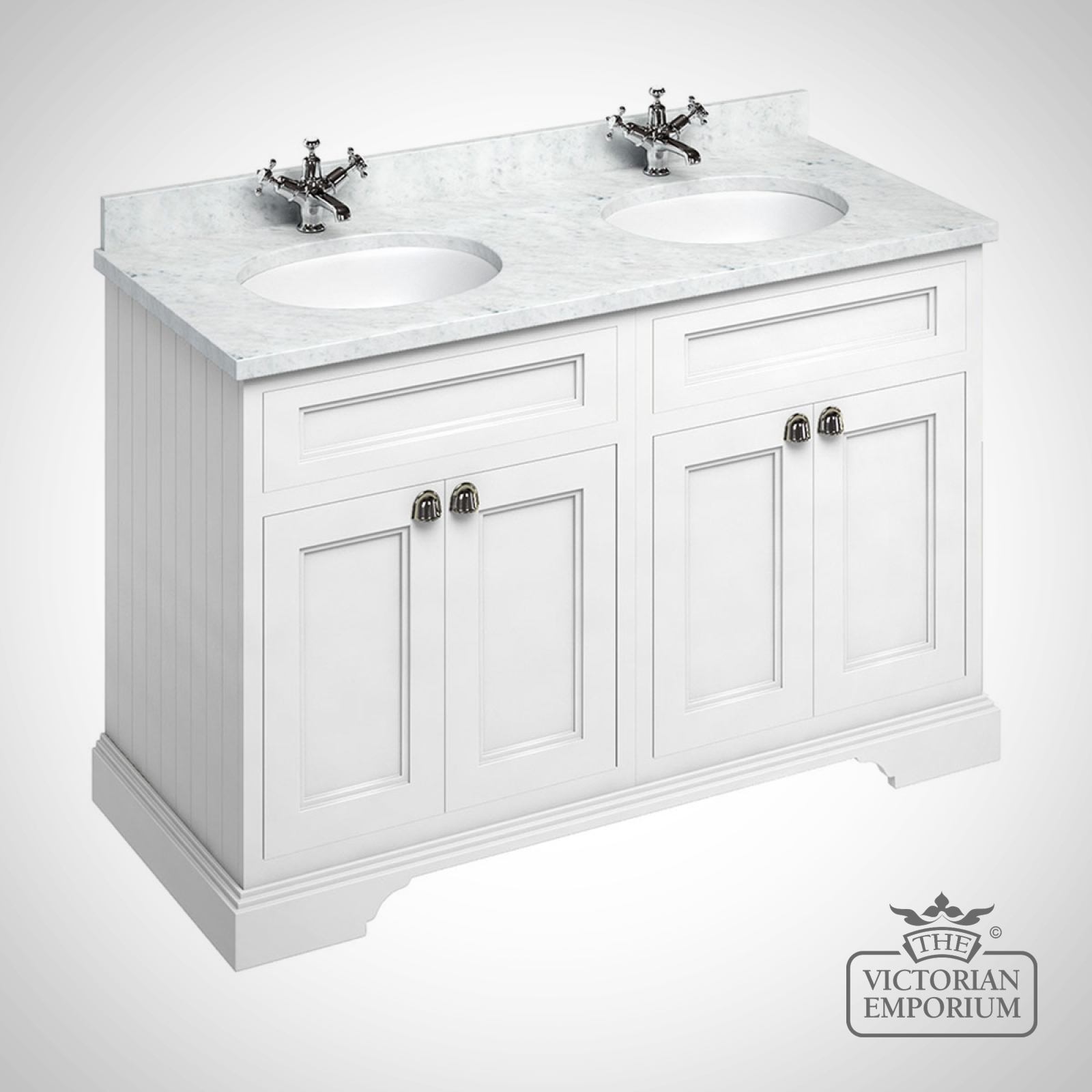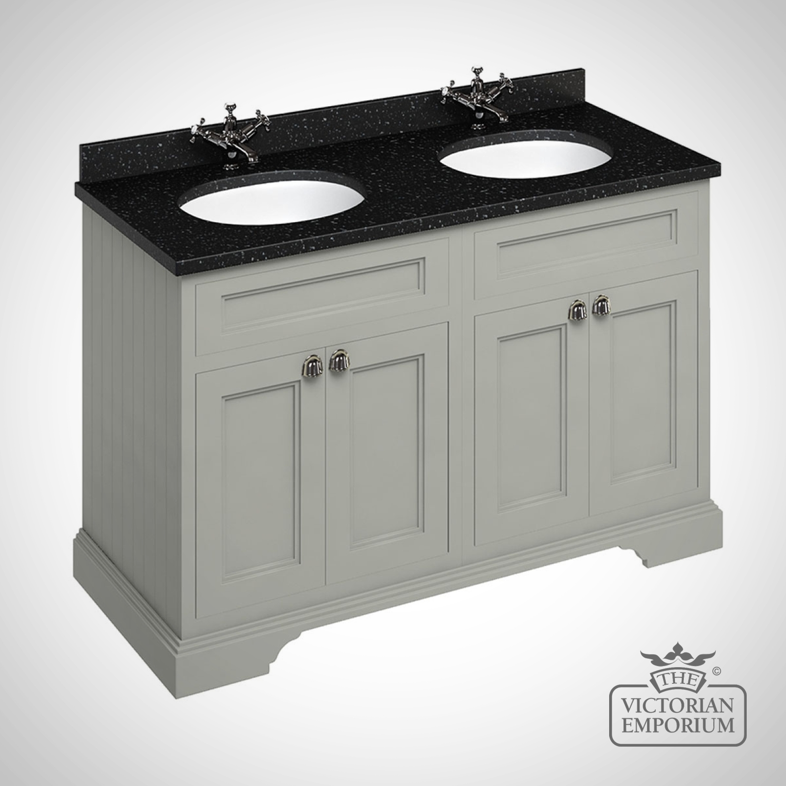 Freestanding 130cm wide Vanity Unit with 4 doors with stone worktop and two fully inset basins - a choice of 4 colours for the unit and Black granite, plain white or white marble effect for the worktop