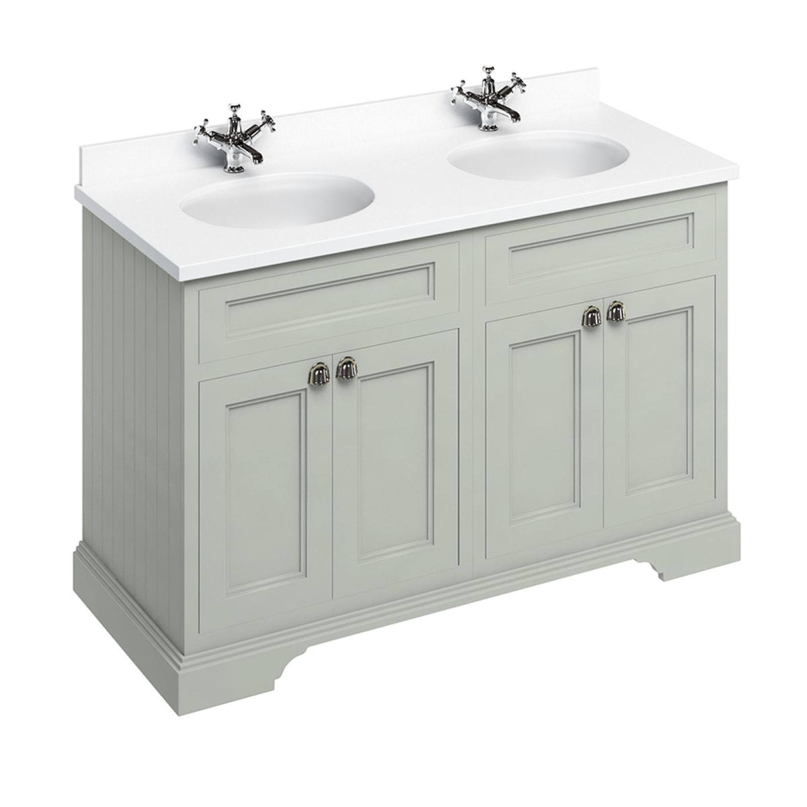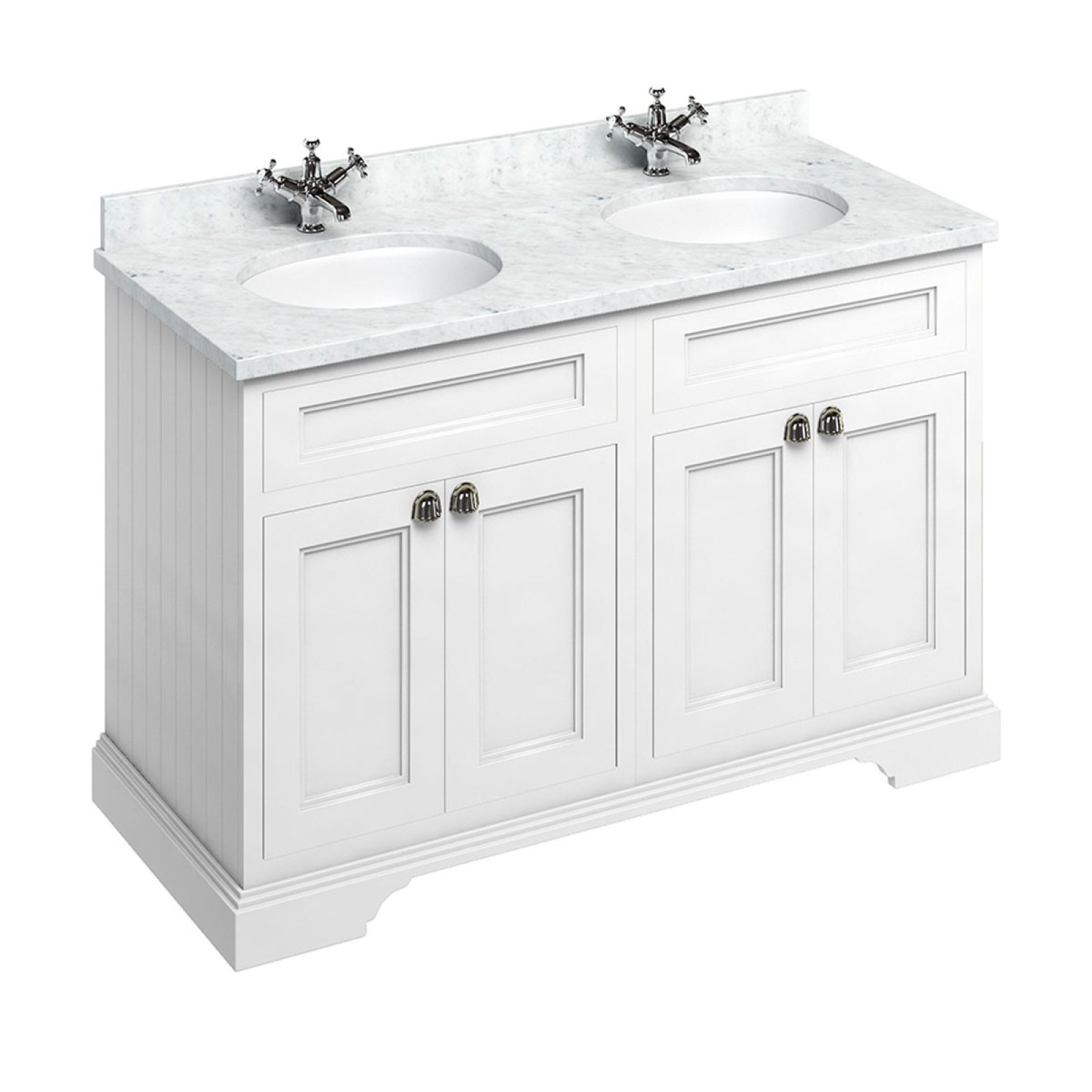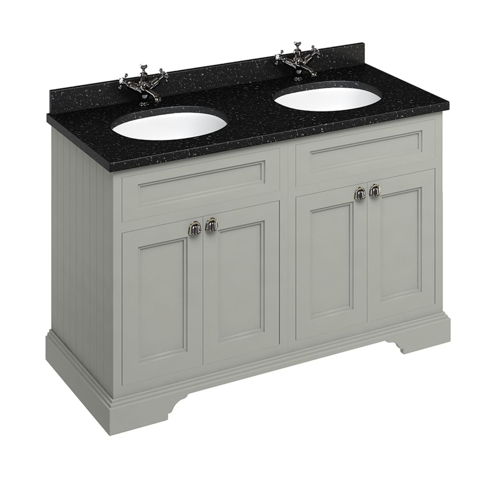 Freestanding 130cm wide Vanity Unit with 4 doors with stone worktop and two fully inset basins - a choice of 4 colours for the unit and Black granite, plain white or white marble effect for the worktop