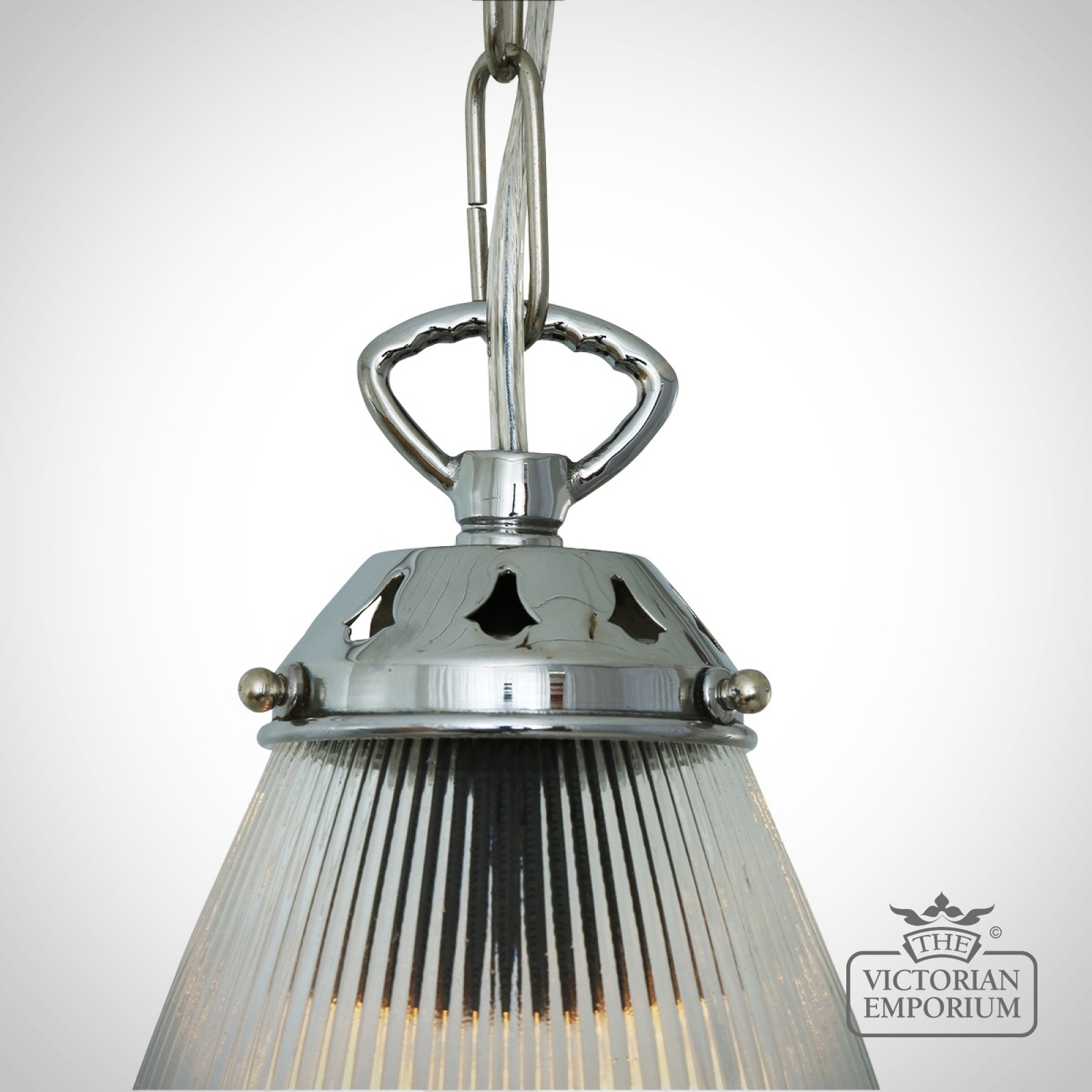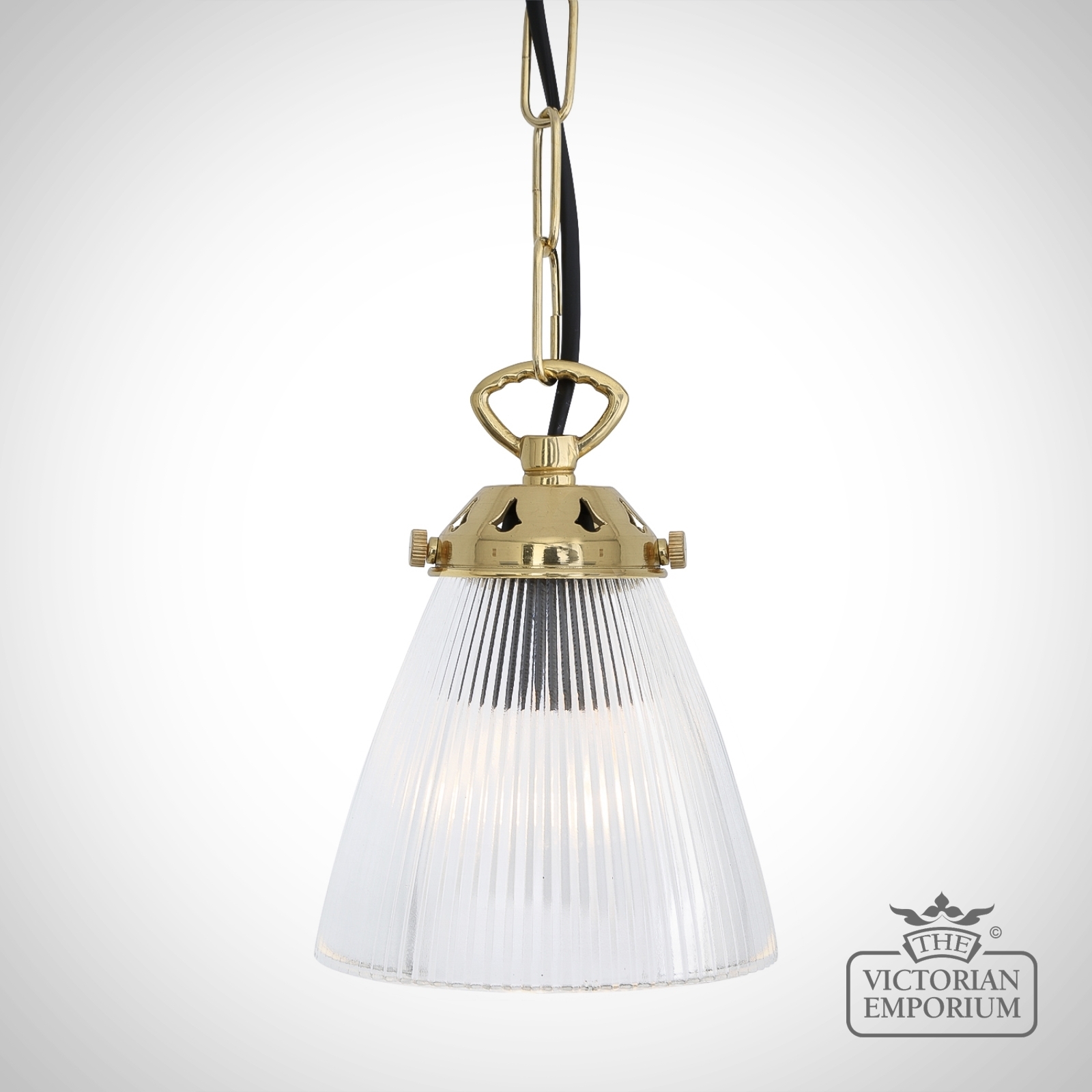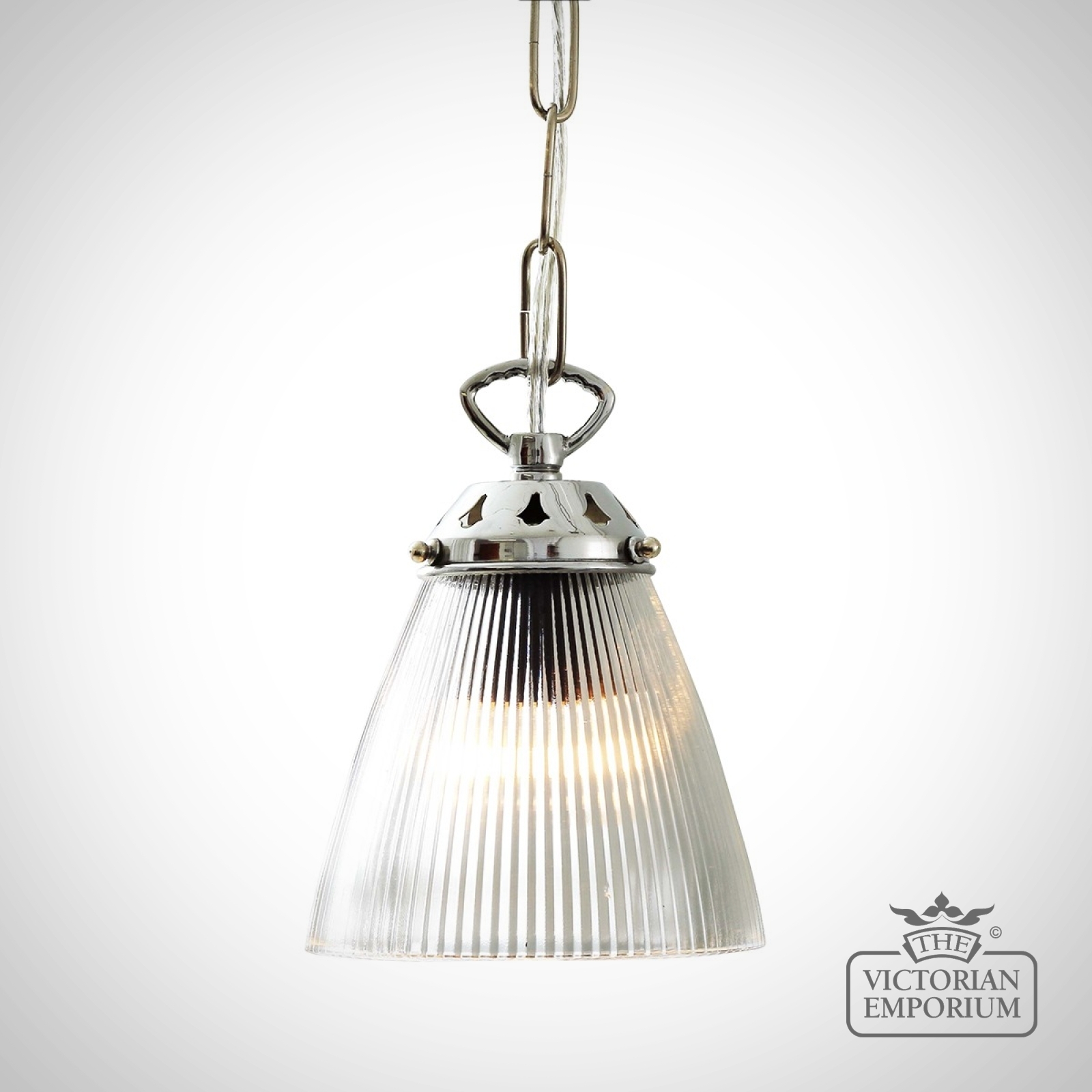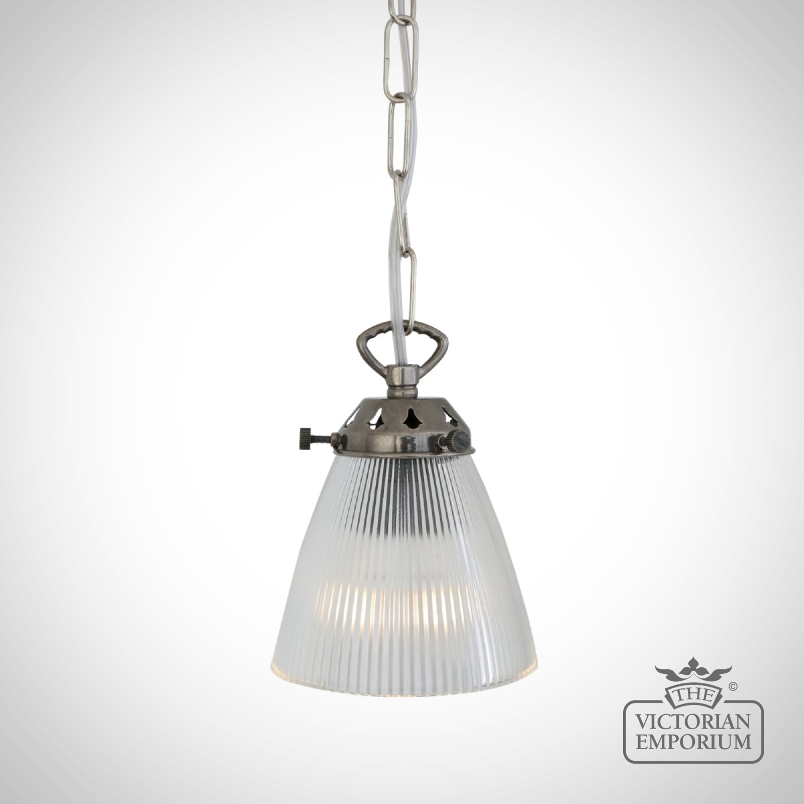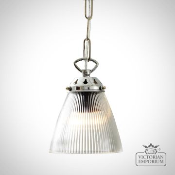 The Gadar Glass Industrial Pendant with Holophane Glass is suited to locations such as above a kitchen island, dining table, workbench or desk.