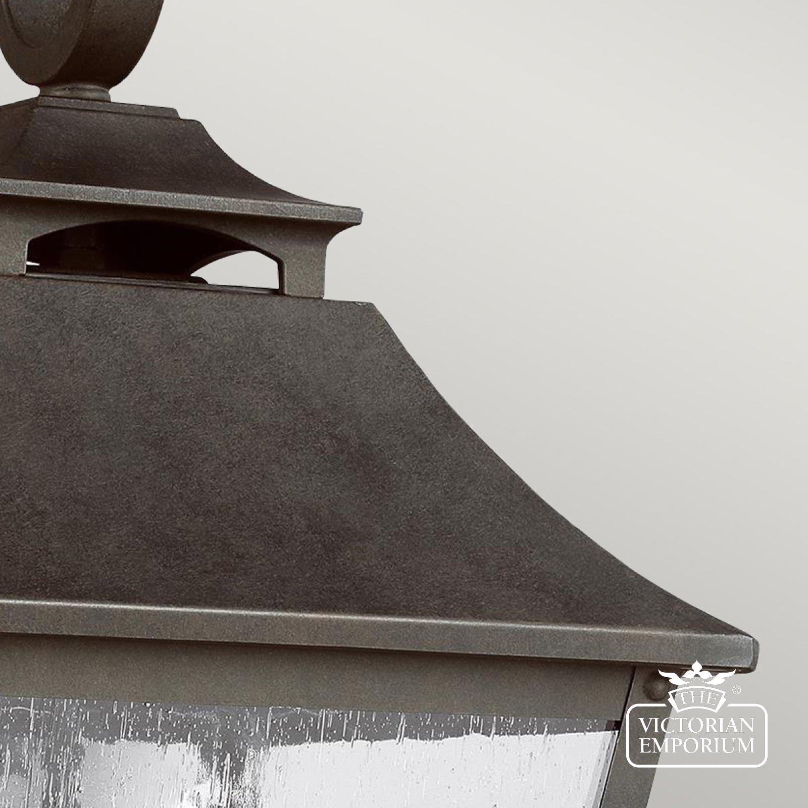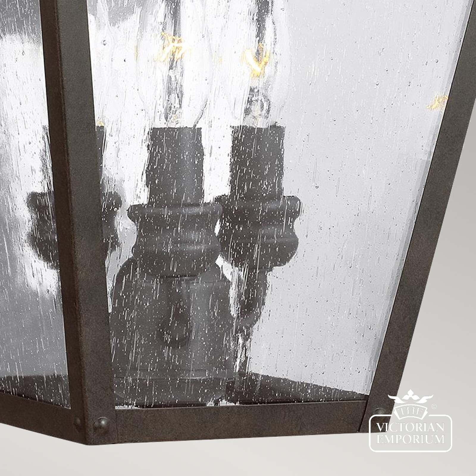 The Galena outdoor lantern collection has an Elegant simple design with clean lines and Seeded Glass, it is available in a Sable finish. IP44 rated.